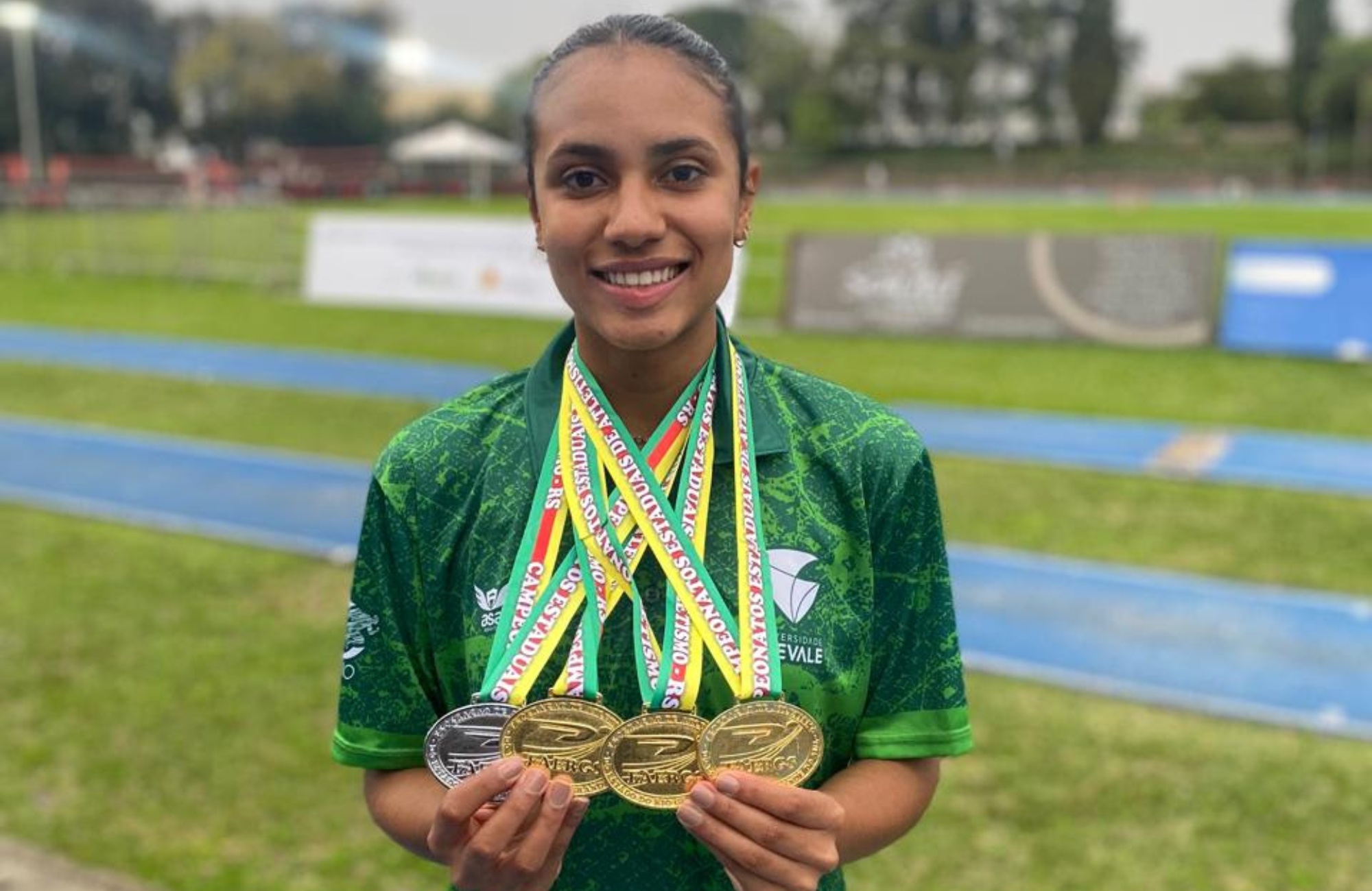 Duas atletas do Programa Esporte Universitário da Feevale subiram ao pódio do Campeonato Estadual de Atletismo Adulto, realizado neste sábado (31) em Porto Alegre. Rayssa Oliveira conquistou três medalhas de ouro e obteve recordes no salto em distância (melhor marca pessoal com 5,92m), 100m com barreiras (melhor marca pessoal e recorde da competição com 14,40s) e 200 metros rasos, além de duas pratas nos revezamentos 4x100m e 4x400m. Tamires Pohren obteve medalhas de prata nas duas provas que disputou, 400 metros rasos e 400 metros com barreiras.
