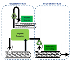 Por meio da tecnologia, a Braskem e seus parceiros conseguirão separar ambas as camadas (poliolefínicas e não poliolefínicas) permitindo inseri-las adequadamente na reciclagem mecânica ou avançada. Este processo funciona da seguinte maneira: dentro de uma máquina, denominada extrusora reativa (nº 1 na imagem), as embalagens são fundidas a altas temperaturas e submetidas a diferentes processos químicos que possibilitem a remoção das camadas não poliolefínicas.