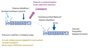 Por meio da tecnologia, a Braskem e seus parceiros conseguirão separar ambas as camadas (poliolefínicas e não poliolefínicas) permitindo inseri-las adequadamente na reciclagem mecânica ou avançada. Este processo funciona da seguinte maneira: dentro de uma máquina, denominada extrusora reativa (nº 1 na imagem), as embalagens são fundidas a altas temperaturas e submetidas a diferentes processos químicos que possibilitem a remoção das camadas não poliolefínicas.