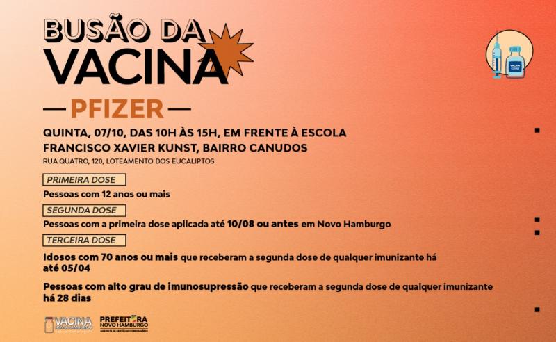A Unidade Móvel de Vacinação da Secretaria de Saúde de Novo Hamburgo, o Busão da Vacina, estará na próxima quinta-feira, 7 de outubro, das 10h às 15h, em frente à Escola Municipal de Ensino Fundamental Francisco Xavier Kunst, localizada na Rua Quatro, 120 – Loteamento dos Eucaliptos. Serão aplicadas, exclusivamente com o imunizante da Pfizer, para a primeira, segunda e terceiras doses .
