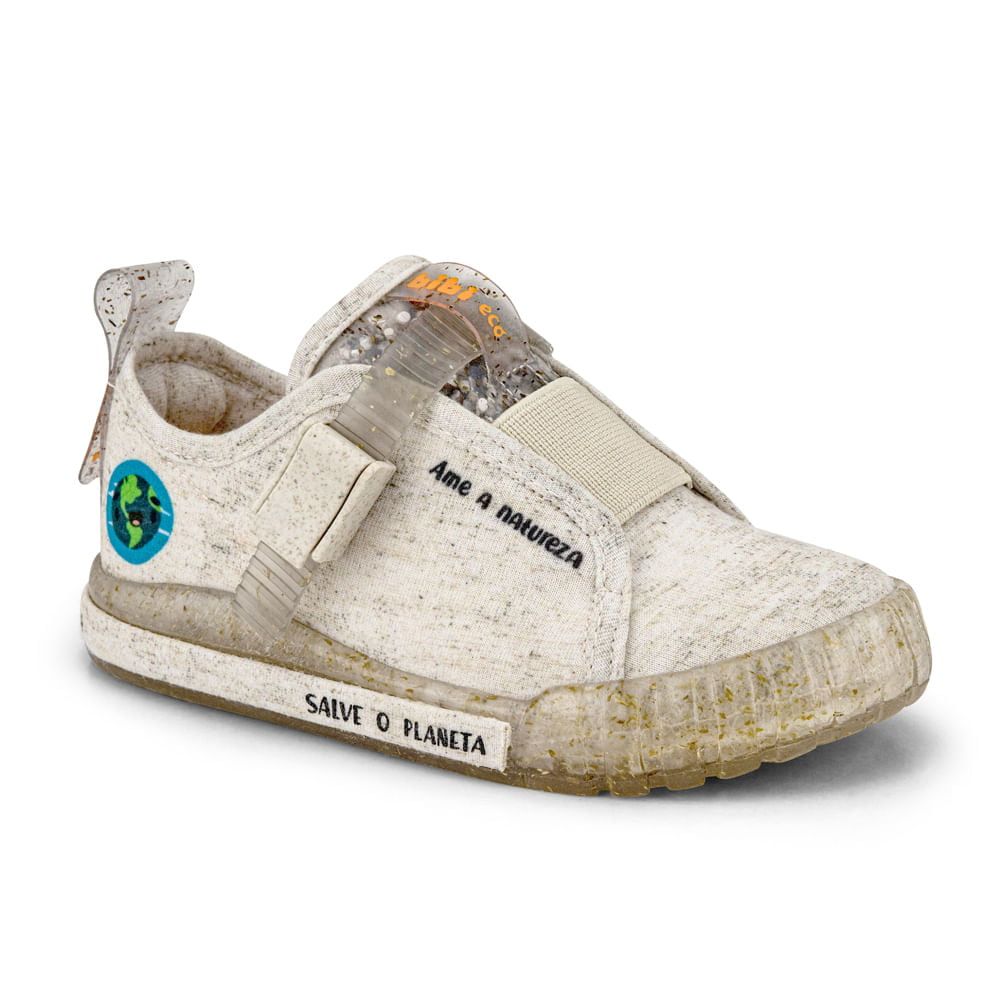 Com cor unisex que remete à naturalidade, o Bibi Eco tem grande parte dos seus componentes reciclados. O solado é fabricado em TR transparente com serragem e o cabedal produzido a partir de garrafas PET. O processo de colagem é feito com cola base de água, assim como em todas as linhas. Com um visual divertido e moderno, o tênis é seguro e facil de calçar com um engate produzido em ECO WPC, matéria-prima composta em 20% por cascas de arroz e tiras de PVC renovável de fibras de bambu.