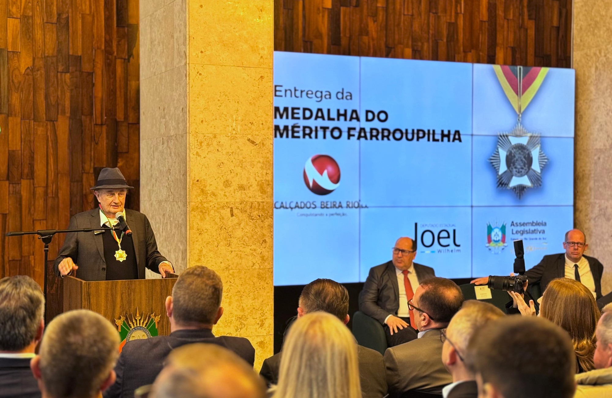A Calçados Beira Rio foi agraciada com a Medalha do Mérito Farroupilha, a maior honraria pública do Rio Grande do Sul, nesta terça-feira (26), no salão Júlio de Castilhos da Assembleia Legislativa, em reconhecimento aos 50 anos de fundação da empresa. A homenagem foi proposta pelo deputado estadual Joel Wilhelm (PP), presidente da Frente Parlamentar em Defesa do Setor Coureiro-Calçadista.