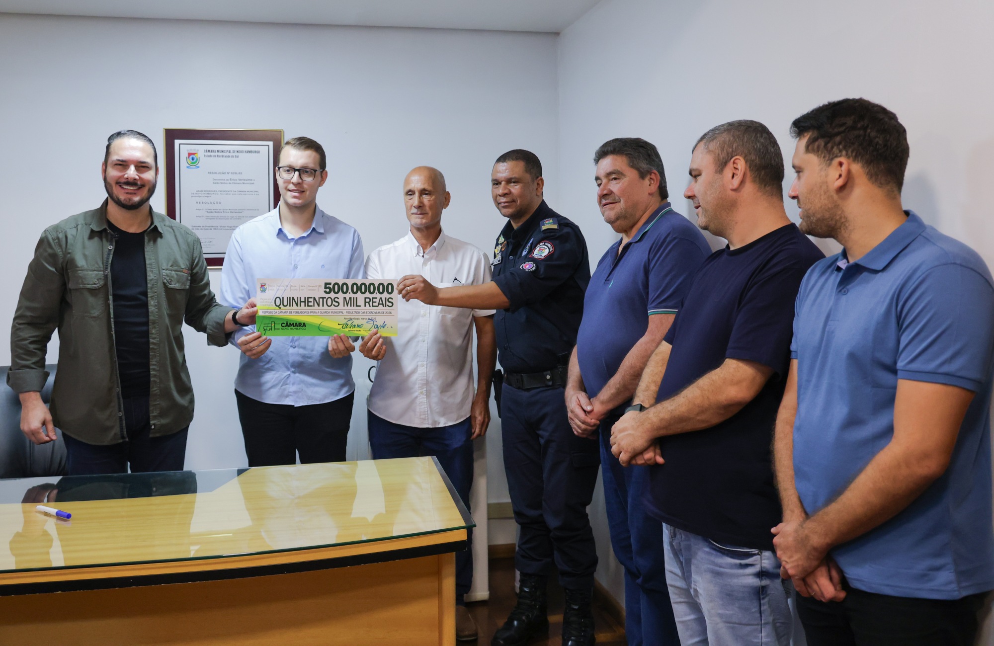 A Câmara de Novo Hamburgo formalizou a destinação de R$ 500 mil para a segurança pública do município, com foco na Guarda Municipal. O ato ocorreu na manhã desta quinta-feira (26), na sede do legislativo, e reuniu representantes dos poderes executivo e legislativo, além de forças de segurança. O recurso é resultado de economias internas da Câmara e será aplicado para reforçar a estrutura e os serviços da área, com o objetivo de atender demandas da Secretaria de Segurança Pública.