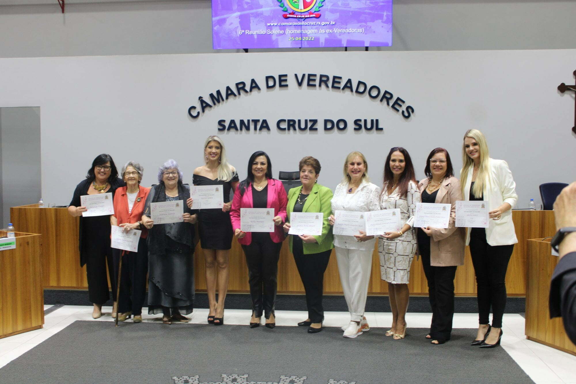 A solenidade foi conduzida pelo presidente Rodrigo Rabuske (PTB). Além de Kelly Moraes e Glória Jacobus, foram entregues certificados em homenagem para as ex-vereadoras Sonia Marli Kessler, Sidônia Goerck, Nubia Bruch, Marla Hansen, Rejane Henn e Solange Finger. A presidência ainda entregou um certificado para as atuais vereadoras Bruna Molz e Nicole Weber.