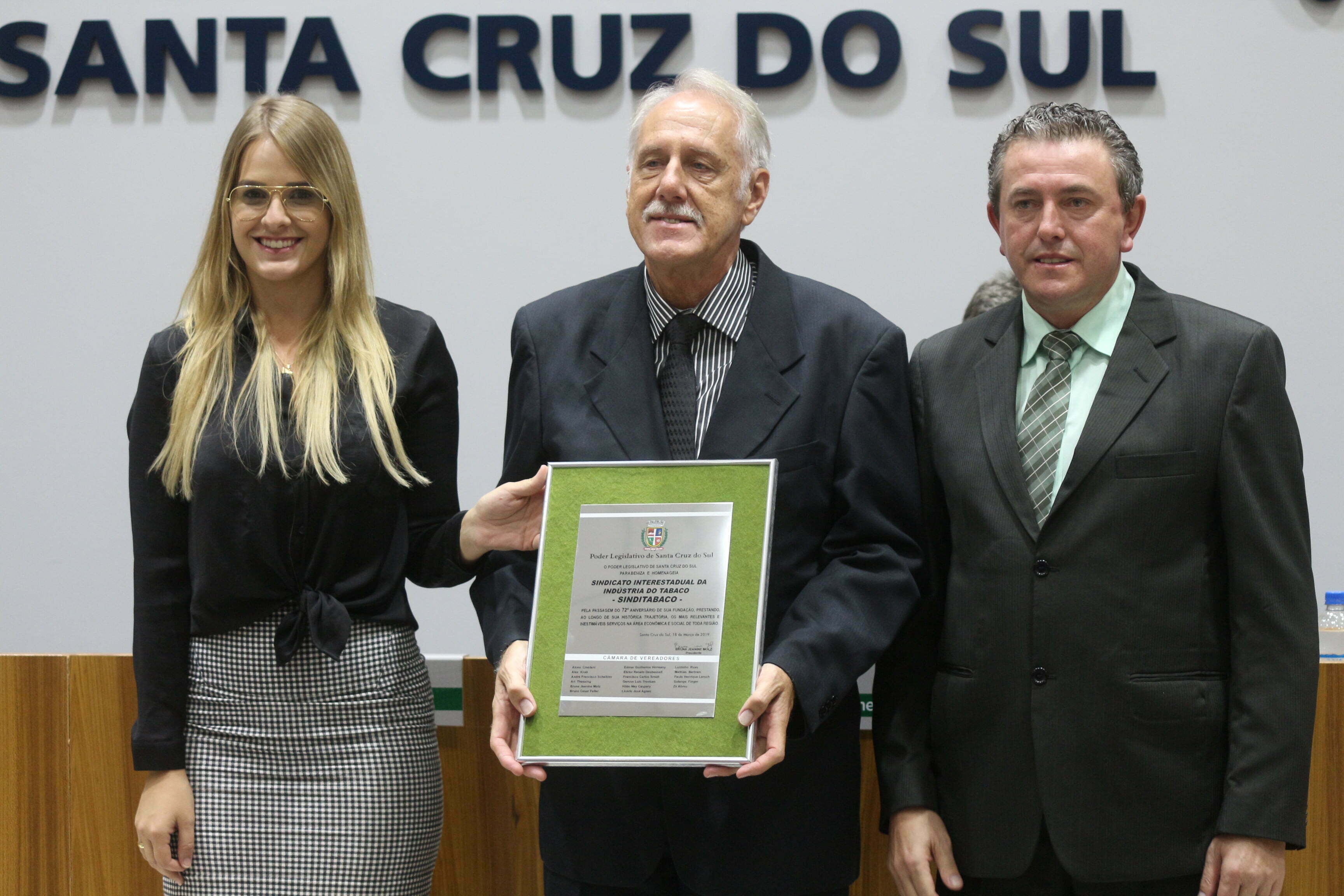 A Câmara de Vereadores de Santa Cruz do Sul realizou uma sessão solene em homenagem ao Sindicato Interestadual da Indústria do Tabaco (SindiTabaco), nesta segunda-feira. A homenagem é pela passagem dos 72 anos de atuação da entidade, numa proposição do vereador Gerson Trevisan (PSDB).