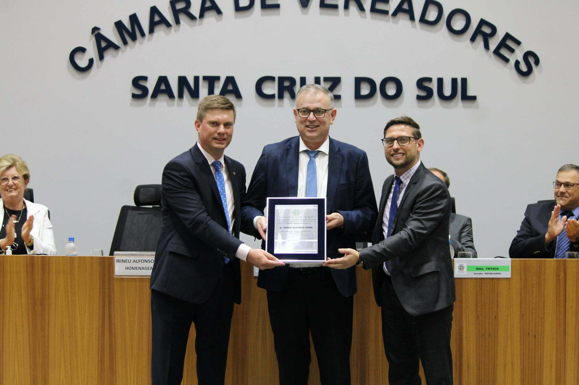 Uma sessão solene foi realizada pela Câmara de Vereadores de Santa Cruz do Sul na noite desta segunda-feira (9), para a concessão do título de Cidadão Santa-cruzense a Irineu Alfonso Henn. Ele é vice-presidente operacional da CTA, de Venâncio Aires, mas que mora em Santa Cruz do Sul, onde possui grandes laços de profissão e de amizade. A proposição foi do vereador e líder de Governo, Henrique hermany.