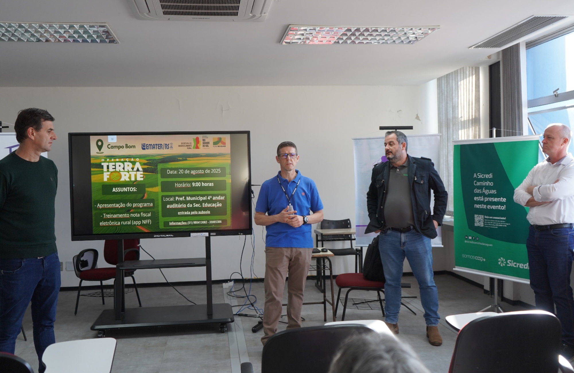 Cerca de 50 agricultores de Campo Bom participaram, na manhã desta quarta-feira (20), da apresentação do Programa Terra Forte – iniciativa do governo estadual voltada à recuperação socioprodutiva, ambiental e ao fortalecimento da resiliência climática da agricultura familiar. A reunião foi conduzida pela Emater/RS-Ascar em parceria com a Prefeitura, por meio da Secretaria de Desenvolvimento Econômico e Turismo (Sedetur).