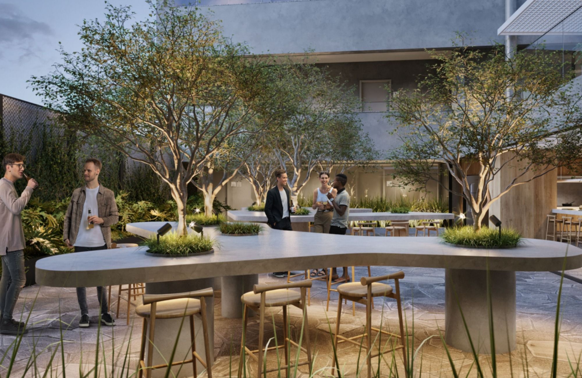 Apresentando espaços que valorizam esse contato do morador com a área externa, o Monjardin reúne dois pátios centrais, um rooftop green lounge com acesso à piscina e à churrasqueira, wellness center e laundry, gastrolobby externo e uma área para coworking. No espaço privativo ao ar livre, há ainda lugares para cantinho dos pets, jardim, jacuzzi ou parrilla para uso dos moradores. O uso das esquadrias piso-teto fazem com que a luz natural seja muito mais perceptível nas áreas internas, além dos grandes pátios internos que favorecem a circulação de ar natural em todos os ambientes.