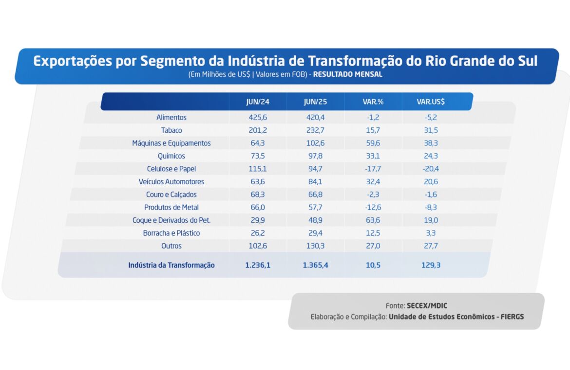 O aumento das exportações no primeiro semestre de 2025 atingiu 16 dos 23 segmentos analisados: veículos automotores (1,6 p.p.), máquinas e equipamentos (1,5 p.p.) e tabaco (1 p.p.) foram os principais responsáveis pelo avanço. Em contrapartida, celulose e papel (-0,8 p.p), madeira (-0,6 p.p) e produtos de metal (-0,2 p.p) apresentaram queda. Alimentos permaneceu estável (-0,1 p.p.) mesmo com os impactos da gripe aviária.