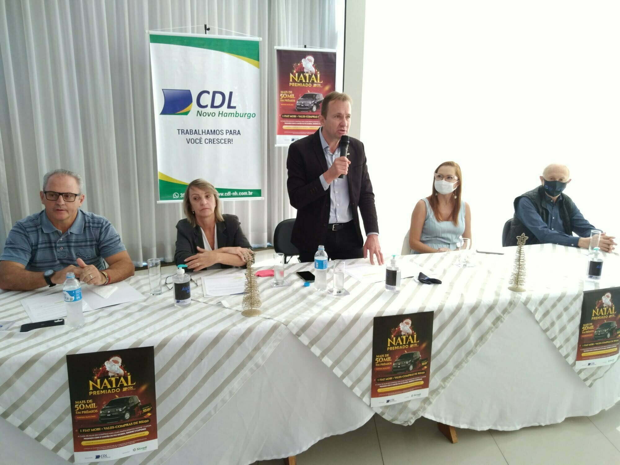 Com a presença de diretores da Câmara de Dirigentes Lojistas de Novo Hamburgo (CDL-NH) e da imprensa foi lançada a Campanha Natal Premiado 2021 na manhã desta terça-feira (9), no Salão Nobre da Entidade. O evento contou também com a presença do presidente da Sicredi Pioneira, Tiago Luiz Schmidt, patrocinador oficial da promoção.
