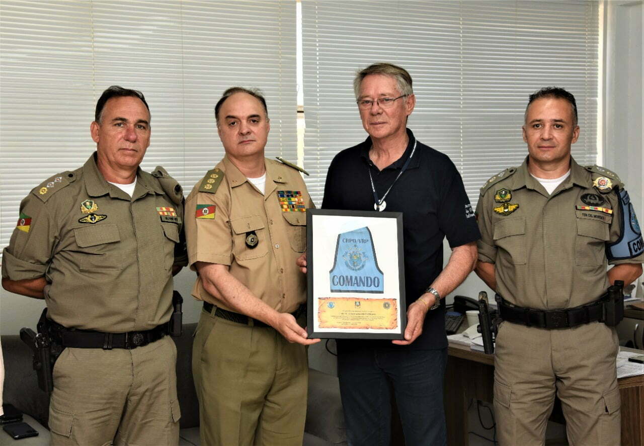 Para oficializar o reconhecimento, o comandante coronel Valmir José dos Reis, entregou hoje 11 de janeiro, ao ex-prefeito, hoje secretário municipal de Obras e Infraestrutura, o braçal emoldurado da gestão do Comando Regional de Polícia Ostensiva do Vale do Rio Pardo (CRPO/VPR). Abaixo, uma inscrição destaca a contribuição de Hermany para a segurança pública, a paz social e o desenvolvimento do município e da região.