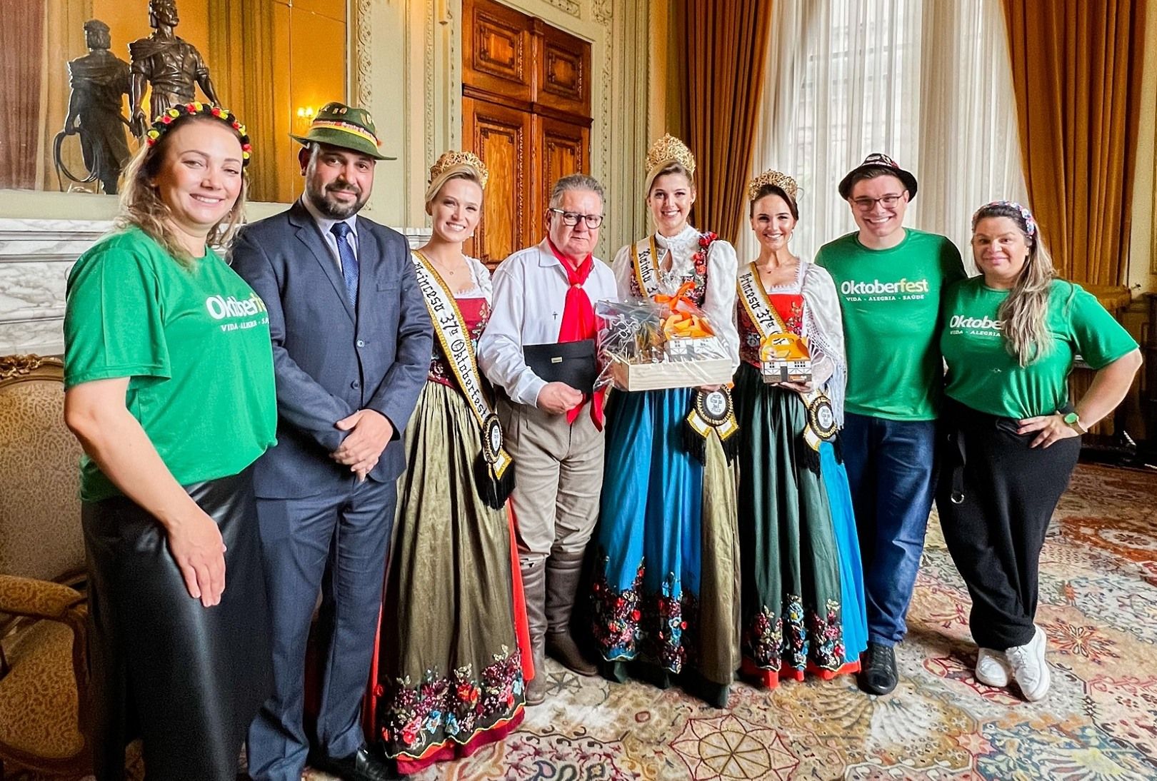Uma comitiva da 37ª Oktoberfest de Santa Cruz do Sul visitou a capital do Estado nesta segunda-feira (19). Na ocasião, os representantes da Oktober e Feirasul 2022 estiveram no Palácio Piratini para entrega do convite oficial ao governador do Estado, Ranolfo Vieira Junior, e na presidência da Assembleia Legislativa, onde foram recebidos pela chefe de Gabinete, Eluza Rafo.
