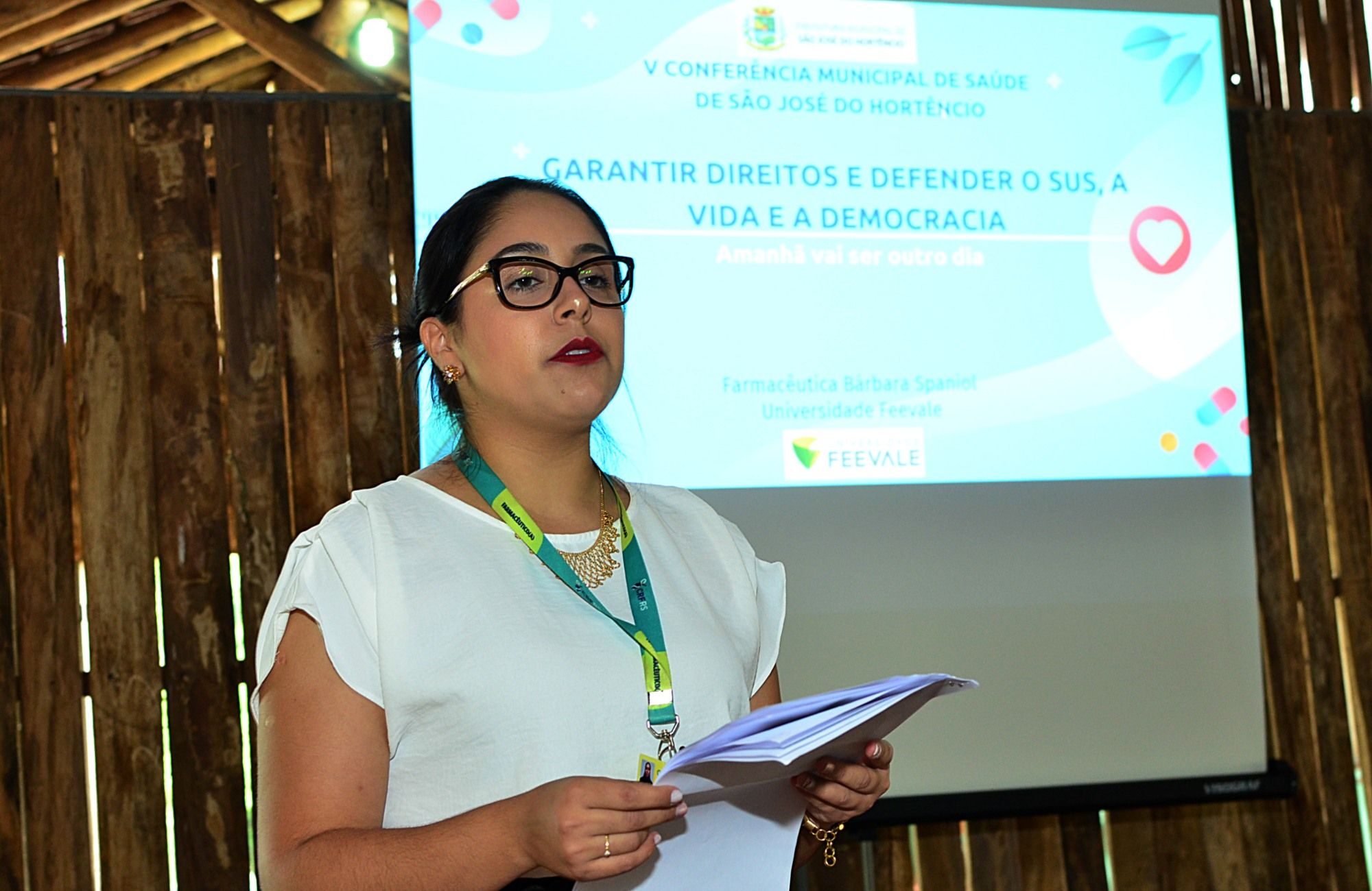 Na palestra da conferência, a mestre em Ciências Farmacêuticas Bárbara Spaniol fez um apanhado da evolução do SUS no Brasil. Num segundo momento falou da distribuição de medicamentos que se faz nas farmácias municipais e elogiou o município de São José do Hortêncio que dispõe para a população um rol de medicamentos maior que o mínimo exigido pela