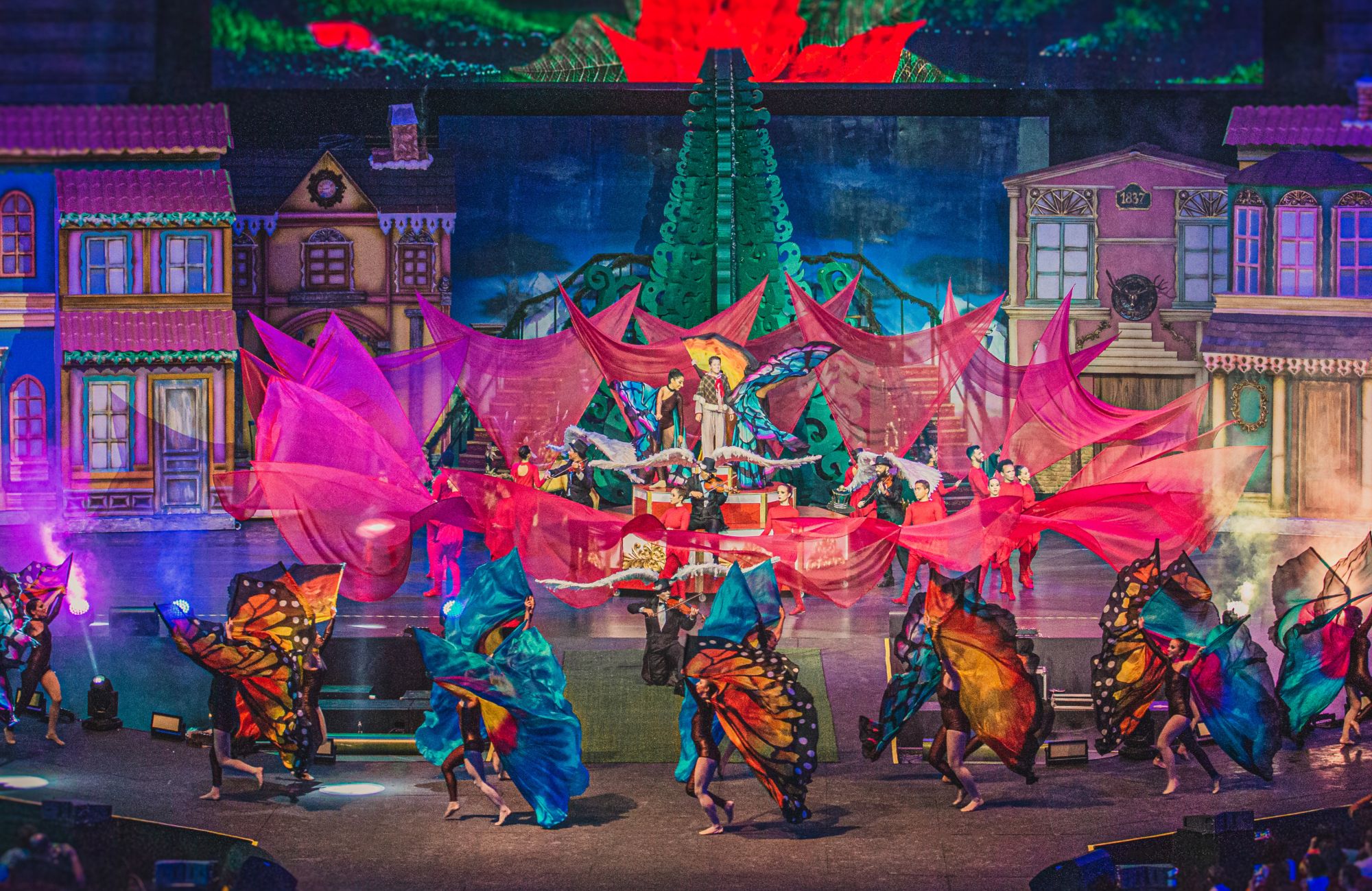 Atores, bailarinos, músicos, acrobatas aéreos, fogos indoor, efeitos especiais e cenários grandiosos compõem o espetáculo que tem roteiro, trilha sonora original, letras, coreografias, cenografia e figurinos exclusivos.