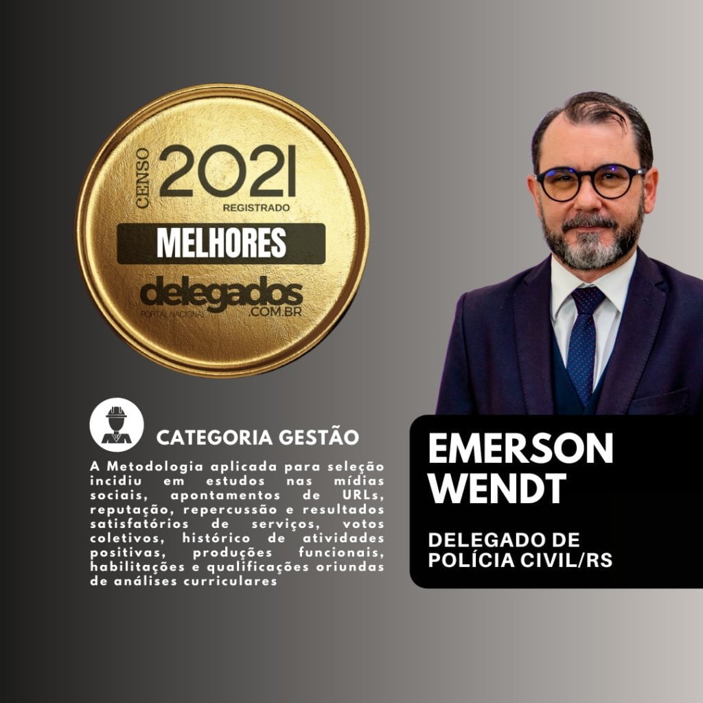 O secretário de Segurança Pública de Canoas, Emerson Wendt, foi eleito um dos melhores delegados de polícia do Brasil em 2021, nas categorias Jurídica e Gestão. Concedida pelo Portal Nacional dos Delegados, em parceria com Revista da Defesa Social, a premiação busca reconhecer, anualmente, os delegados que se destacaram nas suas atividades, através da eficiência e da qualidade dos serviços prestados. É a quarta vez que Wendt ganha o prêmio – foi escolhido nos censos de 2017, 2018, 2019 e 2021.