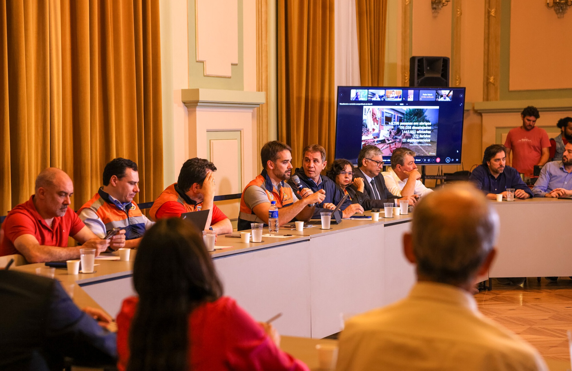 O governador fez a abertura contextualizando a situação atual do Estado, que conta com 401 municípios atingidos, salientando, apesar de tudo, que os eventos ainda estão em andamento. Leite destacou a posição do governo em relação à segurança pública, assistência social, saúde e divulgação de informações, uma vez que circulam boatos que atrapalham o trabalho que está sendo desenvolvido.  O chefe do Executivo estadual reforçou que está em contato com governadores de outros estados para pedir auxílio, em especial aos que fazem parte do Consórcio de Integração Sul e Sudeste (Cosud).