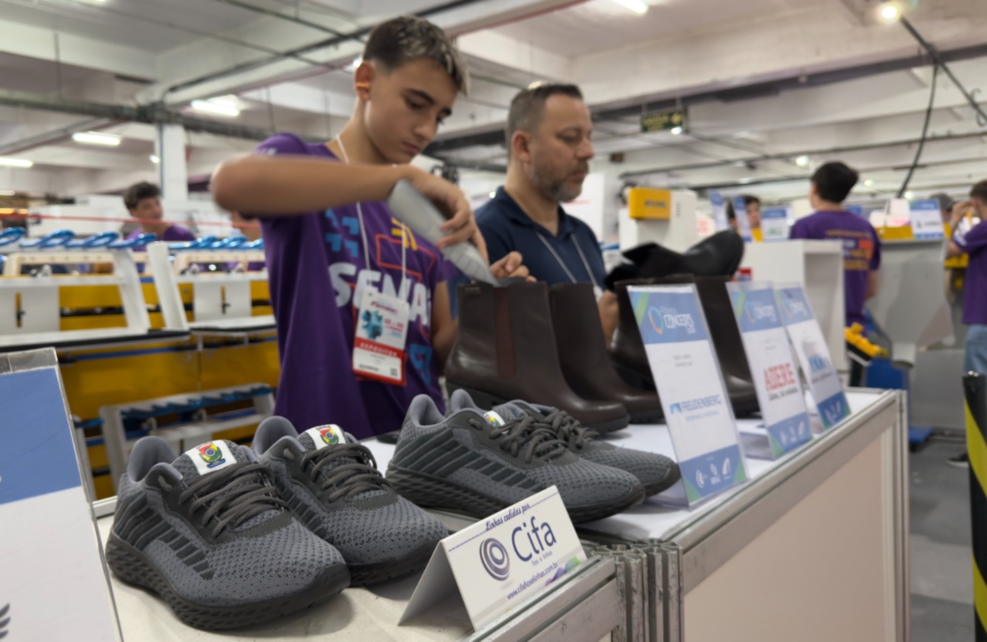 Estudantes do Serviço Nacional de Aprendizagem Industrial (Senai) estão produzindo um modelo de tênis escolar que será doado a alunos da rede municipal de ensino de Novo Hamburgo durante a Fimec 2026, feira do setor coureiro-calçadista realizada na Fenac. A produção ocorre dentro da 16ª edição da Fábrica Conceito, iniciativa que demonstra em tempo real o processo de fabricação de bolsas e calçados no pavilhão do evento, reunindo estudantes e empresas da cadeia produtiva.