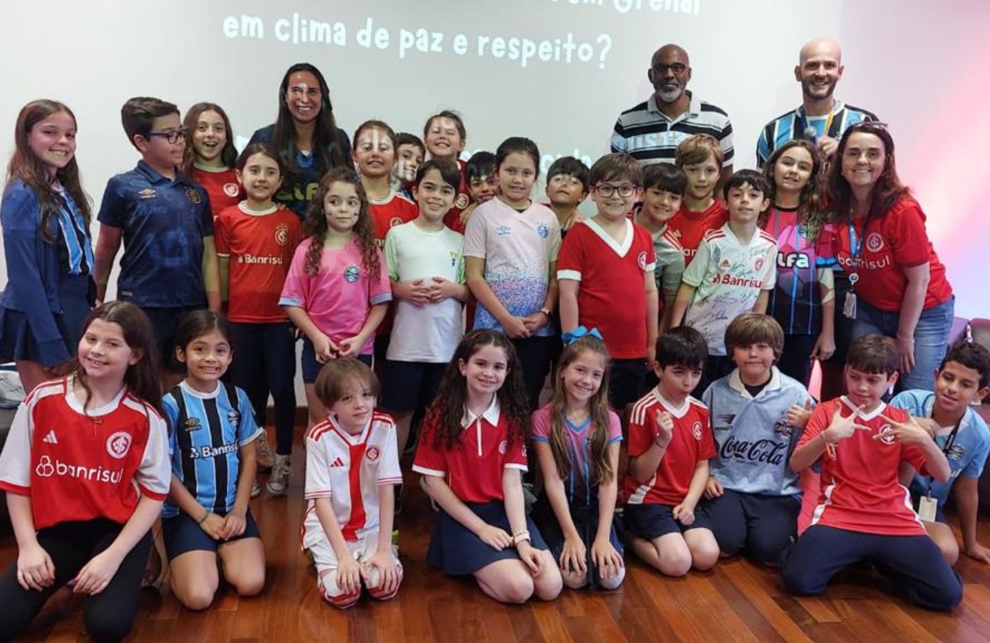 Os convidados acompanharam a atividade esportiva com estudantes do terceiro ano, que tradicionalmente realizam um Gre-Nal simbólico entre as turmas. A proposta busca aproximar os alunos da história dos clubes e reforçar valores relacionados à convivência pacífica.