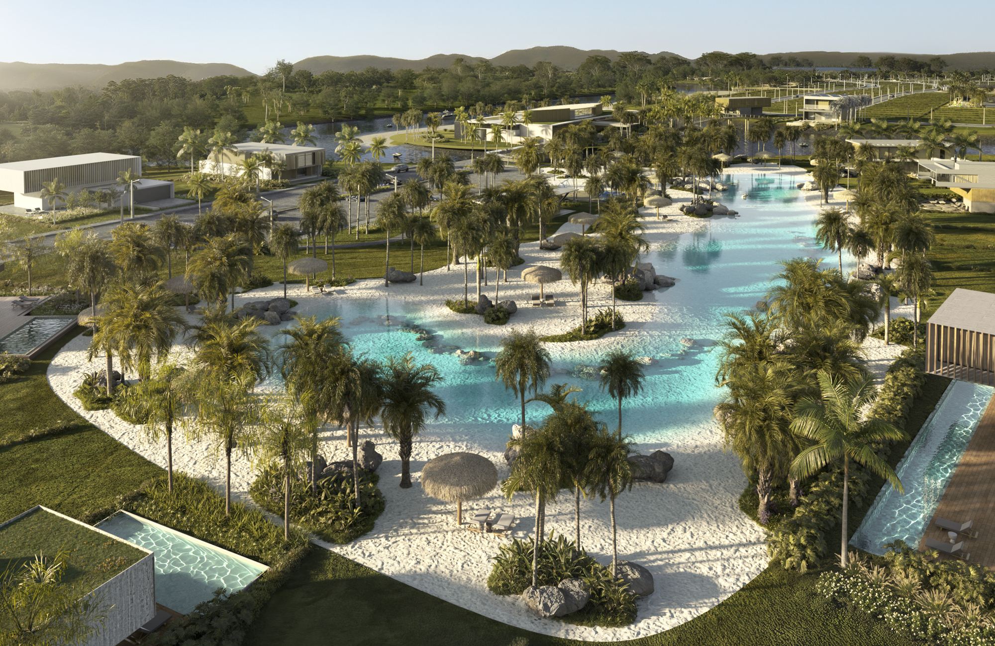 Entre os diferenciais do empreendimento está a construção da maior piscina com praia artificial do Brasil, com 3,5 mil metros quadrados de lâmina d’água e mais de 5 mil metros quadrados de faixa de areia natural, criando uma verdadeira experiência de resort à beira-mar — mesmo dentro do condomínio. O projeto inclui ainda píer flutuante, passarela à beira-rio, atracadouro, heliponto, quadras esportivas, espaços para beach tennis e áreas de convivência pensadas para toda a família.