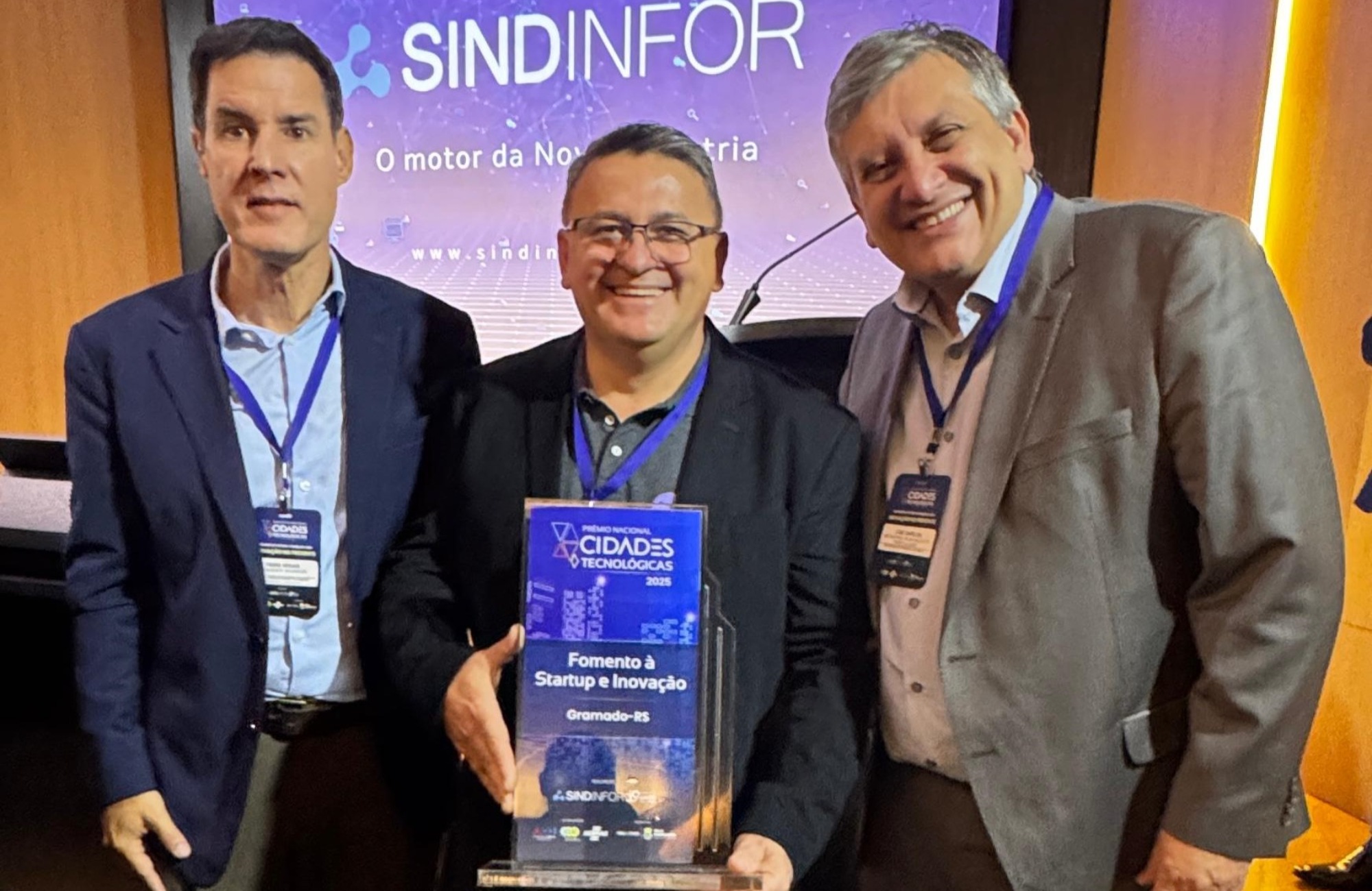 Gramado foi reconhecida na categoria Fomento à Startup e Inovação do Prêmio Nacional Cidades Tecnológicas, concedido pelo Sindicato das Indústrias de Software e da Tecnologia da Informação de Minas Gerais (Sindinfor). A entrega ocorreu na quinta-feira (28), na sede da Federação das Indústrias do Estado de Minas Gerais (FIEMG), em Belo Horizonte, e contou com a participação do secretário de Inovação e Desenvolvimento Econômico de Gramado, André Castilhos, que representou o município.