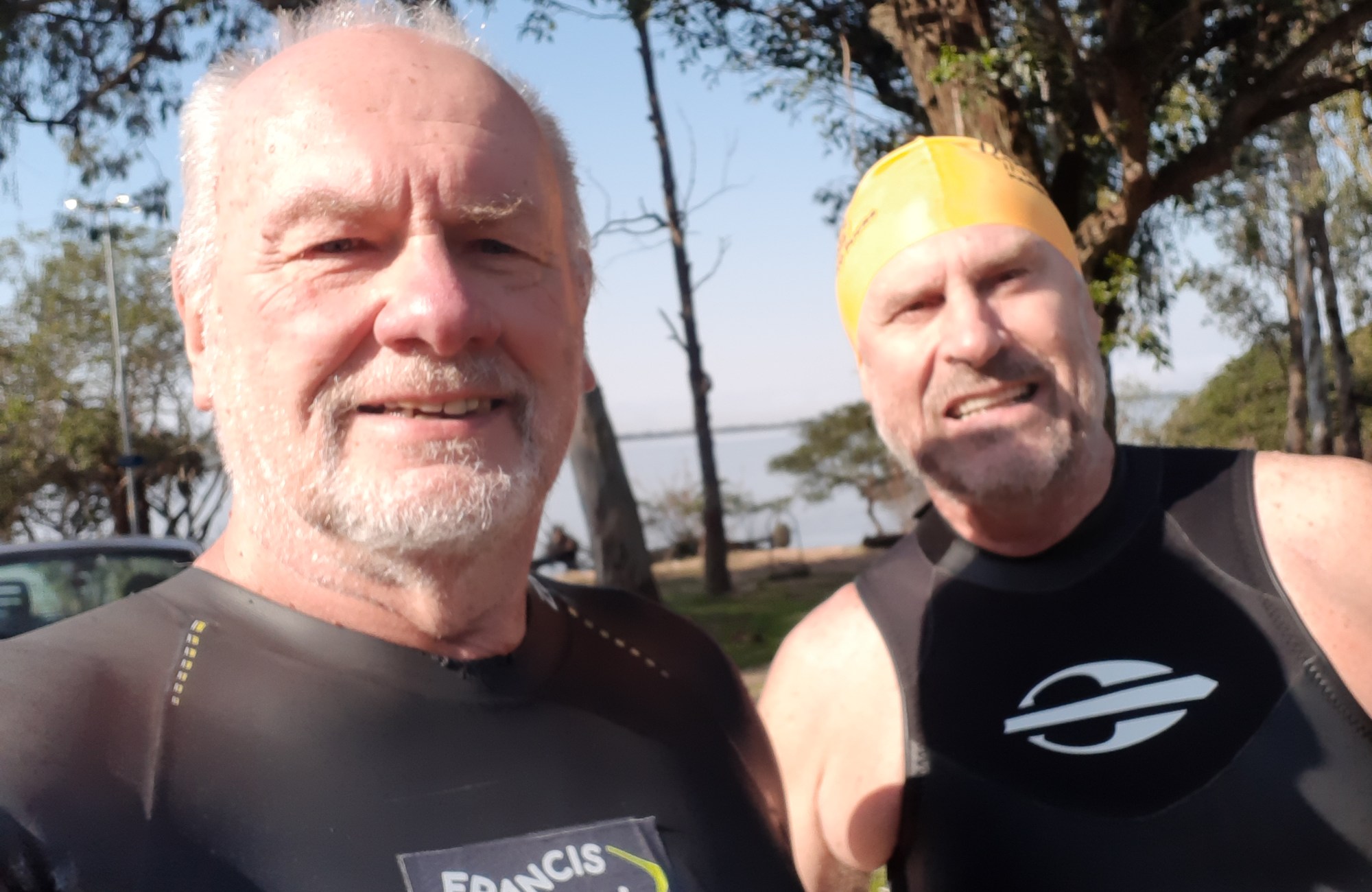O projeto Nadando Pelos Cartões Postais realizou um treino de natação em águas abertas no Lago Guaíba, em Porto Alegre, neste domingo (17). A atividade teve como destaque a participação dos nadadores masters Vilson Thomas, de 66 anos, e do professor e coordenador do projeto, Francismar Siviero, de 70, que encararam a temperatura de 15,6°C em pleno inverno.