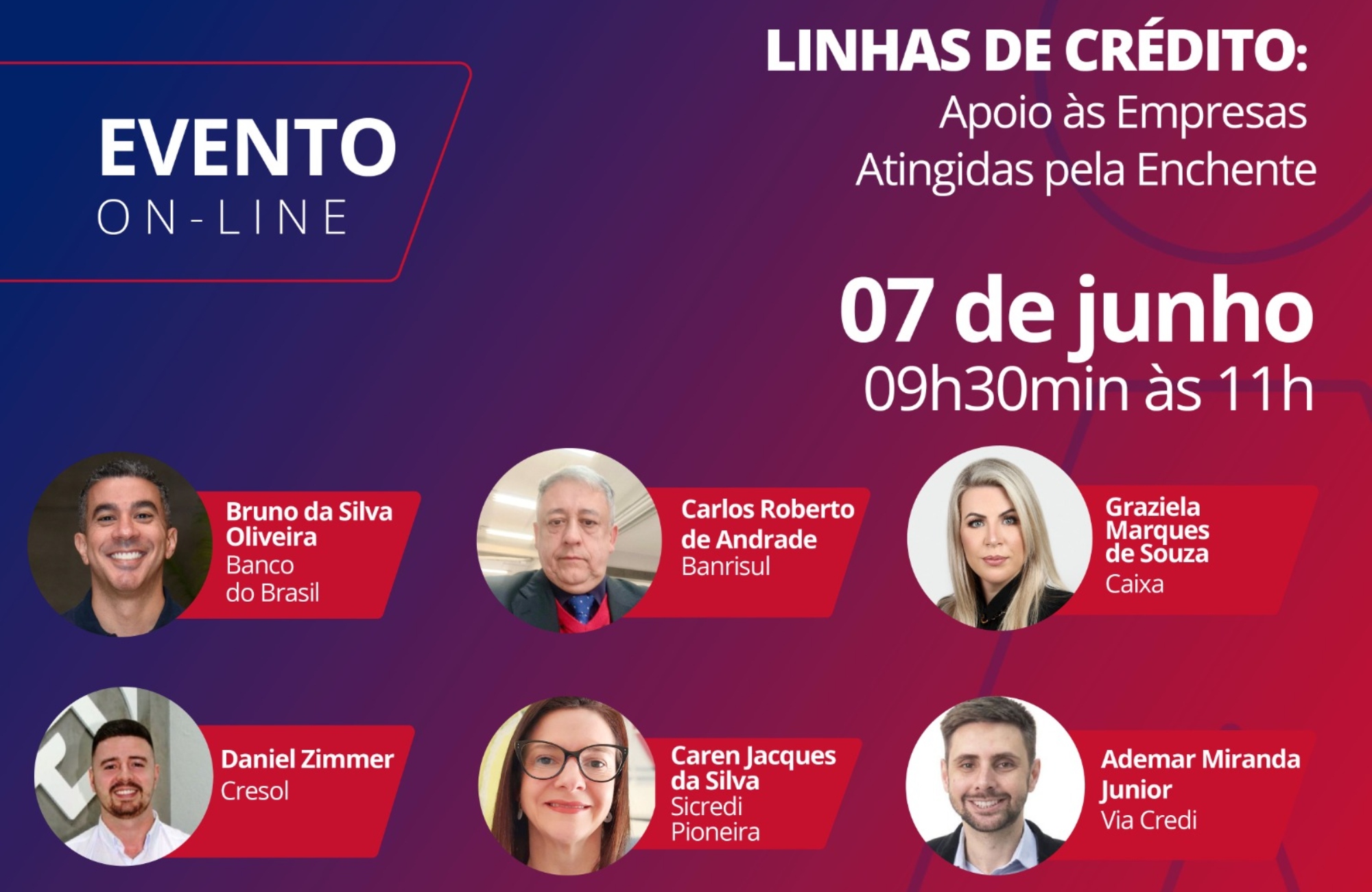 Os participantes são Bruno da Silva Oliveira, gerente-geral do Escritório Corporate Banking Vale do Sinos do Banco do Brasil; Carlos Roberto de Andrade, gerente-geral do Banrisul agência Novo Hamburgo; Graziela Marques de Souza, gerente de carteira PJ da Caixa; Daniel Zimmer, gerente da agência Cresol em Novo Hamburgo; Caren Jacques da Silva, coordenadora de Ciclo de Crédito da Sicredi Pioneira; e Ademar Miranda Junior, gerente regional da Via Credi.