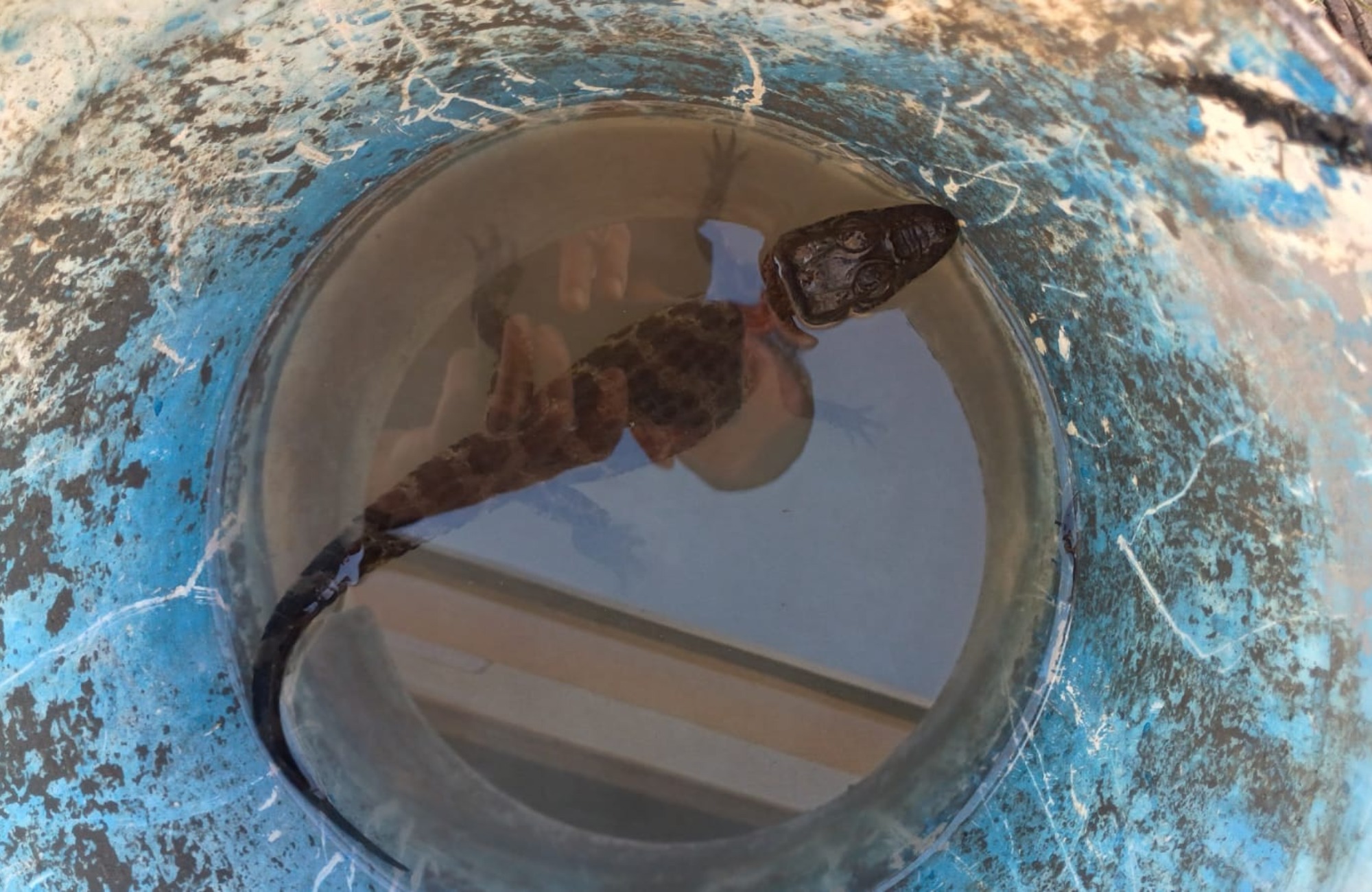 Segundo o biólogo Carlos Normann, se trata de um jacaré-do-papo-amarelo (Caiman latirostris), filhote com cerca de quatro meses e um metro de comprimento. A espécie é típica da fauna local, habita os banhados do Rio dos Sinos, alimenta-se de pequenos invertebrados e insetos e está ameaçada de extinção.