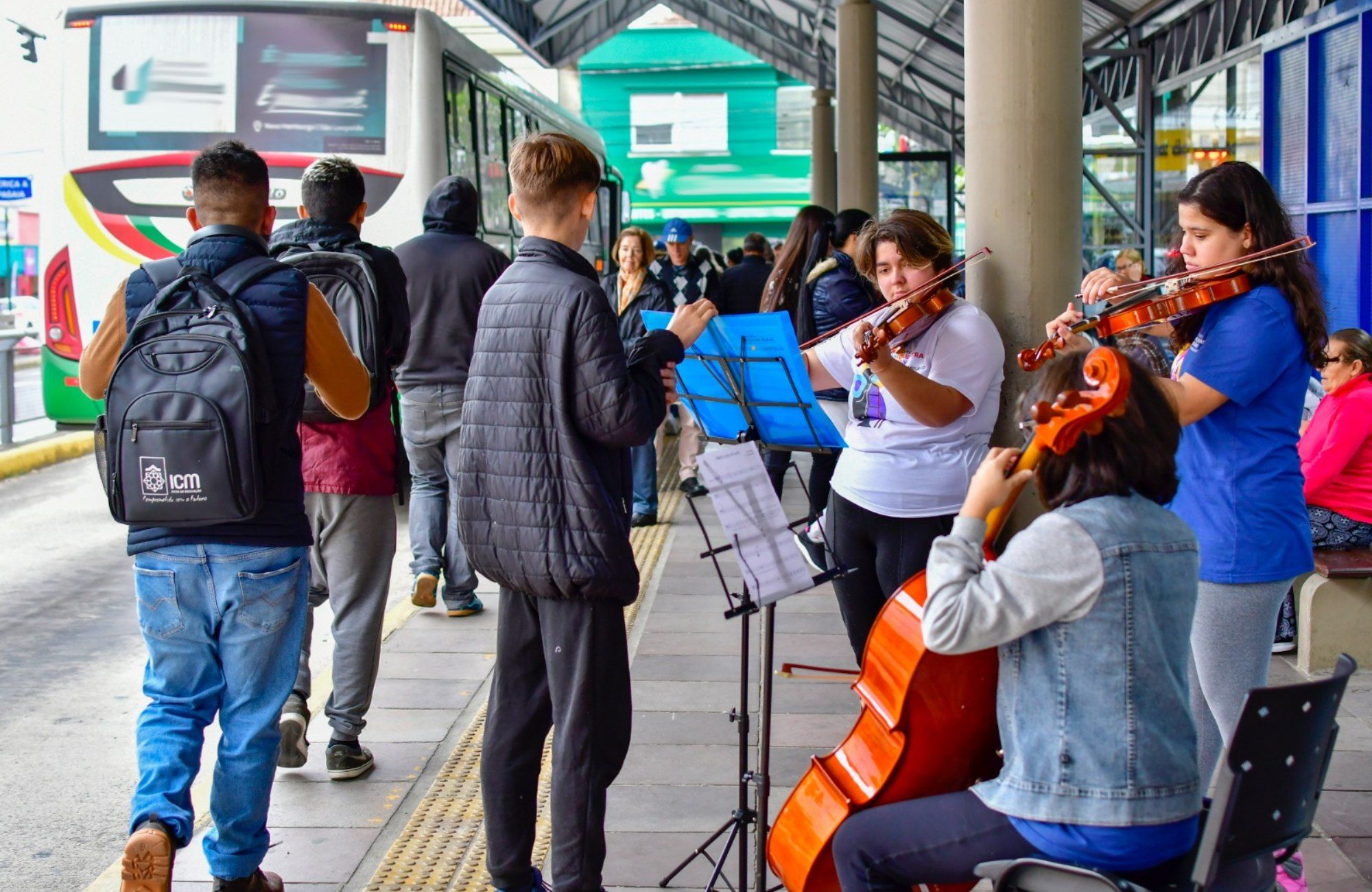 Novo Hamburgo está respirando música durante esta semana. Começou no sábado (22) e segue até dia 30 de julho o 1º Festival Internacional de Música de Novo Hamburgo (FeMusik). Para marcar o evento, jovens do Núcleo de Orquestras Jovens do Município estão levando a música para paradas de ônibus. Na manhã desta segunda-feira (24), o som de violinos, violoncelo e contrabaixo se misturou ao de pedestres e o trânsito no Terminal Rodoviário da Avenida 1º de Março, o Paradão do Centro.