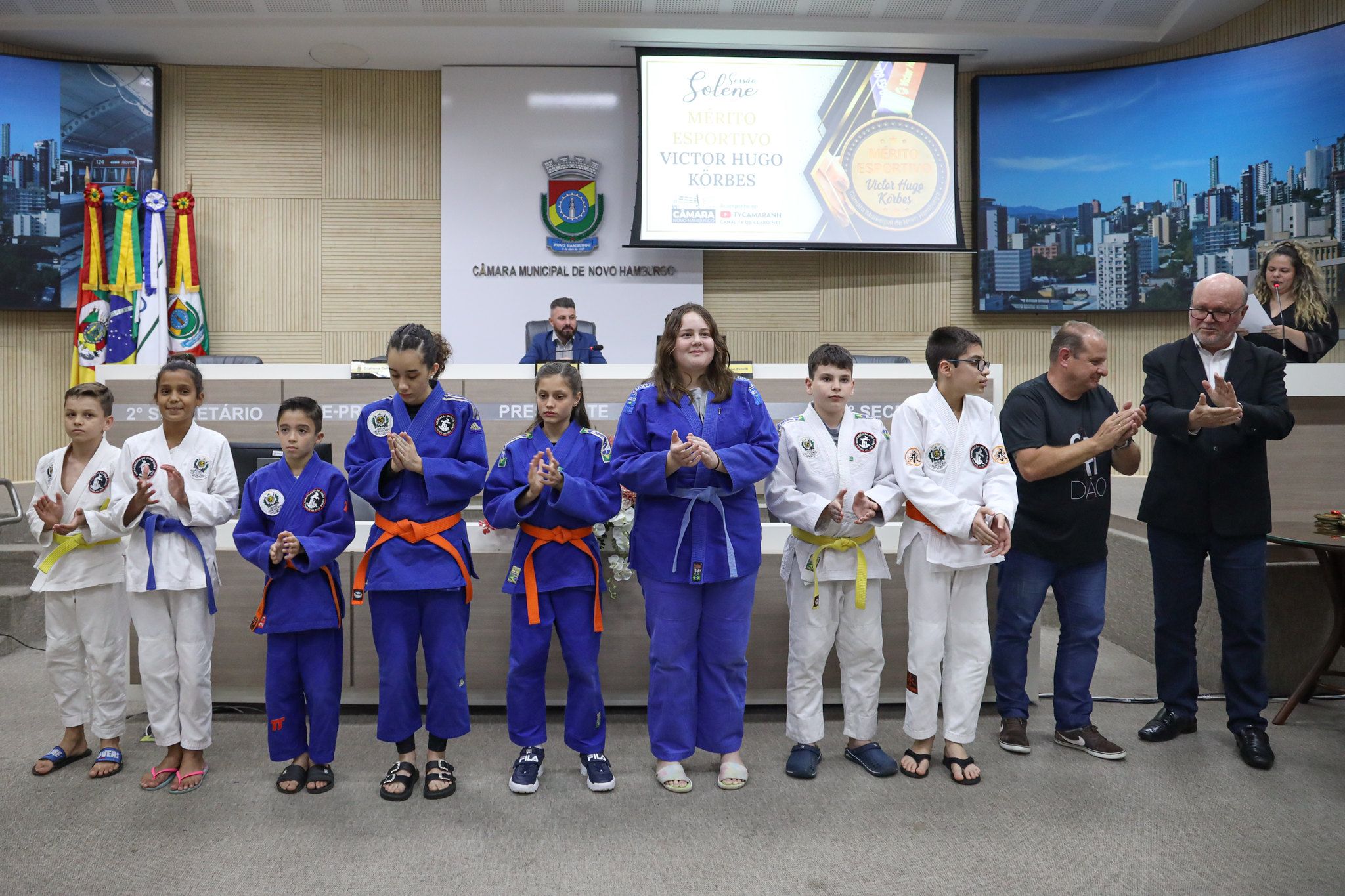 As habituais pautas e discussões políticas deram espaço na noite desta terça-feira (22), a aplausos acalorados em homenagem a cerca de 120 atletas de Novo Hamburgo que receberam, em sessão solene, a Medalha Mérito Esportivo Victor Hugo Körbes. Por iniciativa do vereador Gustavo Finck (PP), por meio do Requerimento nº 37/2022, foram homenageados hamburguenses ou inscritos em agremiações esportivas da cidade por suas conquistas em âmbito estadual, interestadual, nacional e mundial. Também foram laureados com certificados os clubes representados pelos competidores. As modalidades premiadas foram judô, bicicross, atletismo, punhobol, handebol e taekwondo. “Essa honraria é o maior prêmio de mérito esportivo da cidade. Que seja mais um impulso e um incentivo. Vocês são o futuro de Novo Hamburgo. Vocês são campeões”, destacou o parlamentar.