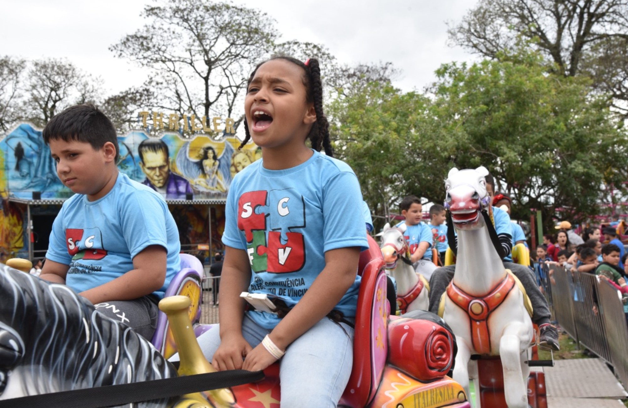 Em Santa Cruz do Sul, mais de mil crianças participaram de um passeio gratuito no Parque Tupã nesta terça-feira (18). A ação foi organizada pela Secretaria de Habitação, Desenvolvimento Social e Esporte, em parceria com o Parque e a Associação de Entidades Empresariais de Santa Cruz do Sul (Assemp). Foram contempladas crianças de diversos locais, referenciadas nos Cras Integrar, do Bairro Bom Jesus, Cras Beatriz Jungblut, do Bairro Santa Vitória, Cras Central, atendidas por entidades como a Associação Educacional e Social para Crianças e Adolescentes (Aesca), pelo projeto Alegria e Esperança, realizado pela Ordem Auxiliadora de Senhoras Evangélicas (Oase), Centro Marista Nossa Senhora da Boa Esperança, e Associação Beneficente Sinal de Amor (ABSA). Crianças e adolescentes que participam dos projetos Craques da Bola, Cidadãos do Amanhã, e Guarda-Costas, realizado pela Secretaria de Segurança e Mobilidade Urbana, também participaram.