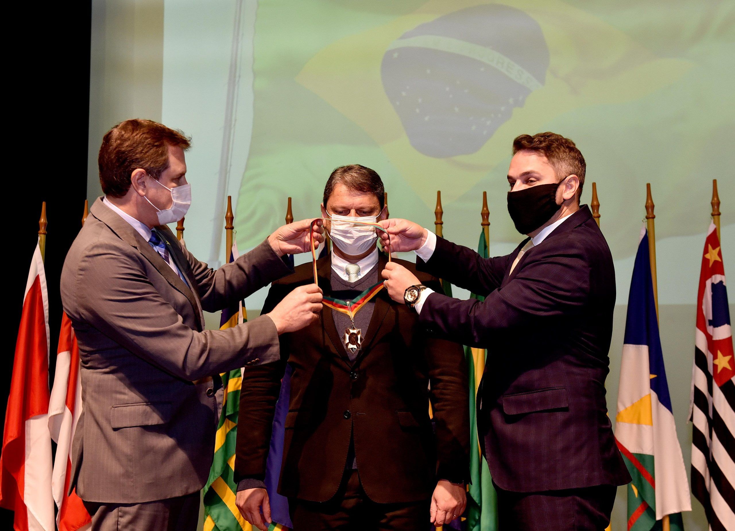 A Assembleia Legislativa concedeu a Medalha do Mérito Farroupilha, maior distinção do Parlamento gaúcho, ao ministro da Infraestrutura, Tarcísio Gomes de Freitas, na manhã desta sexta-feira (9). A iniciativa foi dos deputados Ernani Polo (PP) e Tenente-coronel Zucco (PSL), e a cerimônia ocorreu no Teatro Dante Barone com a presença de autoridades civis e militares.