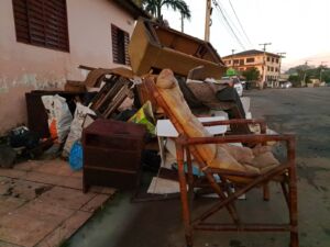 Móveis estragados pela enchente devem ser deixados em frente às casas