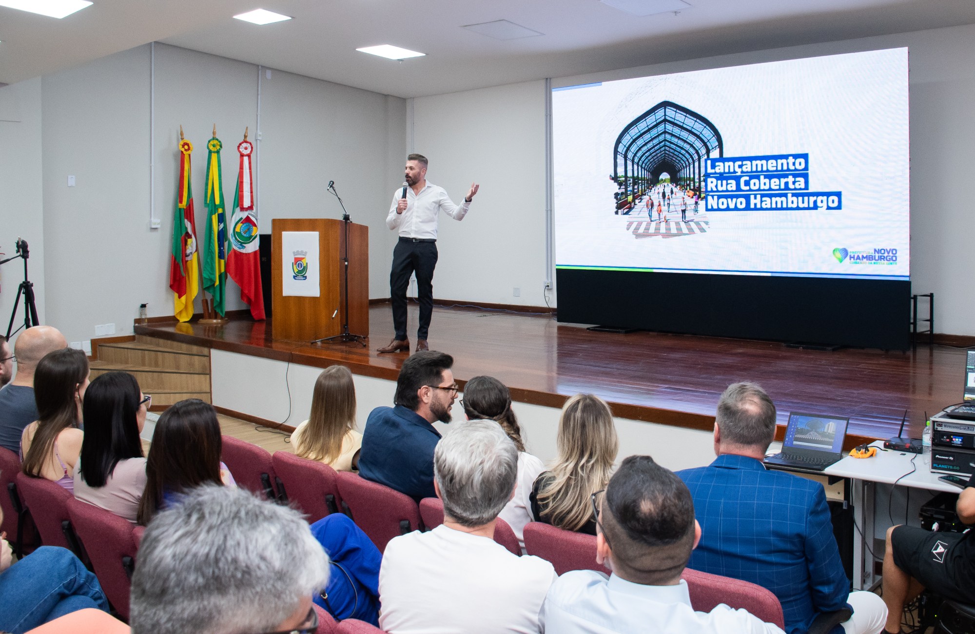 O idealizador do projeto, o engenheiro civil Róger de Oliveira, apresentou as características da estrutura e as possibilidades de uso do novo espaço. “Sou morador da cidade e me sinto honrado em estar participando deste processo”, afirmou Oliveira. Segundo ele, o local foi pensado para atender diferentes perfis de público e ampliar o calendário de eventos de Novo Hamburgo.