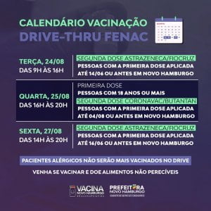Neste dia o drive-thru de vacinação será para a aplicação de SEGUNDA DOSE do imunizante da AstraZeneca / Fiocruz para quem tomou a primeira dose até o dia 14 de junho ou antes em Novo Hamburgo.