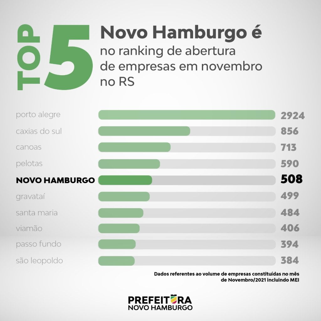 A Junta Comercial Industrial e Serviços do Rio Grande do Sul (JucisRS) publicou nesta semana um ranking dos dez municípios gaúchos com maior constituição de empresas no mês de novembro deste ano. O município de Novo Hamburgo é um dos destaques, ficando no top 5, com a criação de 508 novas empresas, incluindo Microempreendedor Individual (MEI).