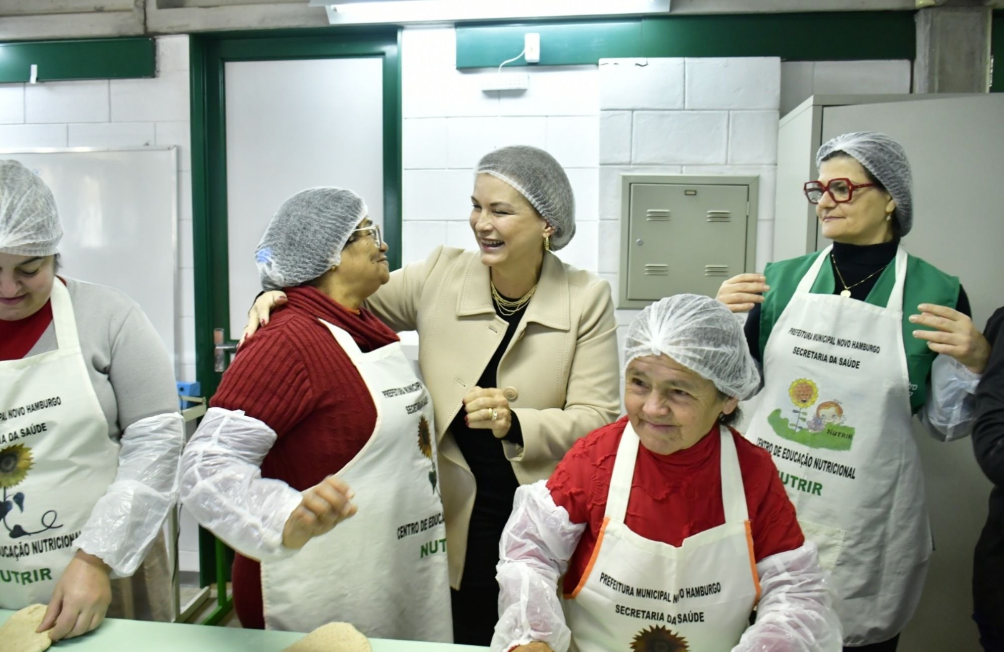 A Prefeitura de Novo Hamburgo lançou na manhã desta quinta-feira (20), a segunda etapa do Projeto Pão, que oferece oficinas de geração de renda, na área de panificação, para pessoas de baixa renda. O lançamento ocorreu no Centro de Educação Nutricional, Nutrir, que fica junto às escolas Favo de Mel e Arnaldo Grin, no bairro Santo Afonso, durante a primeira oficina. “Além de todos os benefícios já ditos aqui, este projeto traz também a memória afetiva. Eu aprendi a fazer pão em casa vendo minha vó e minha mãe fazendo. Certamente o netinho e a netinha irão assistir vocês fazendo pães, unindo ainda mais a família”, enfatizou a prefeita.