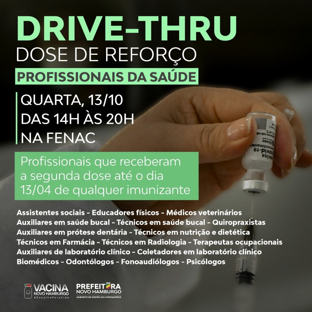 Nesta quarta-feira, 13 de outubro, das 14h às 20h, na Fenac, o drive-thru de vacinação contra a covid será para a aplicação da dose de reforço. Receberão a Terceira Dose os profissionais de saúde que receberam a segunda dose até o dia 13 de abril ou antes de qualquer imunizante.