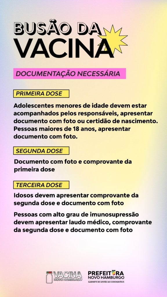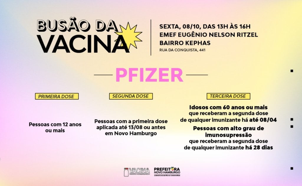 A Unidade Móvel de Vacinação da Secretaria de Saúde de Novo Hamburgo, o Busão da Vacina, estará nesta sexta-feira, 8 de outubro, das 13h às 16h, integrando as ações do projeto “Colorindo Caminhos” no Kephas, que serão realizadas na rua da EMEF Eugênio Nelson Ritzel (Rua da Conquista, 441). Serão aplicadas, exclusivamente com o imunizante da Pfizer, a primeira, segunda e terceiras doses.