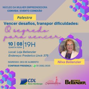 Quebrando paradigmas da relação feminina com segmentos automotivos, a sócia-proprietária da Bellenzier Pneus, Nilva Bellenzier, fará uma palestra com o tema “Vencer desafios, transpor dificuldades: o segredo para vencer”, na quarta-feira, 10 de agosto, a partir das 19h, na loja em Novo Hamburgo, localizada na Avenida Frederico Linck, 375, Centro.