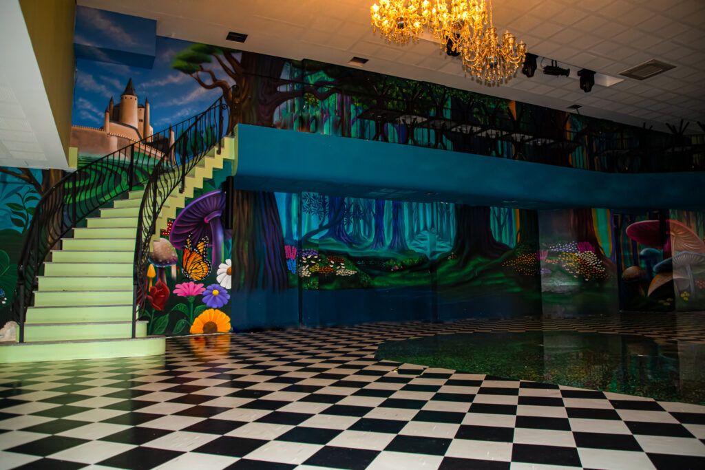 Ao aceitar o convite, o público inicia uma imersão nesse novo mundo cheio de elementos que remetem a uma realidade paralela, passando a se sentir parte integral da fábula. E para tornar ainda mais real, encontrarão a arte assinada por Erick Citron, Ana Scarceli e Leandro Alves, artistas que desenvolveram e executaram a pintura em 3D dos cenários. Traços precisos e cheios de vida trazem referências do livro e reproduzem com riqueza de detalhes uma floresta com cogumelos gigantes, flores e borboletas, em uma explosão de cores e profundidade.