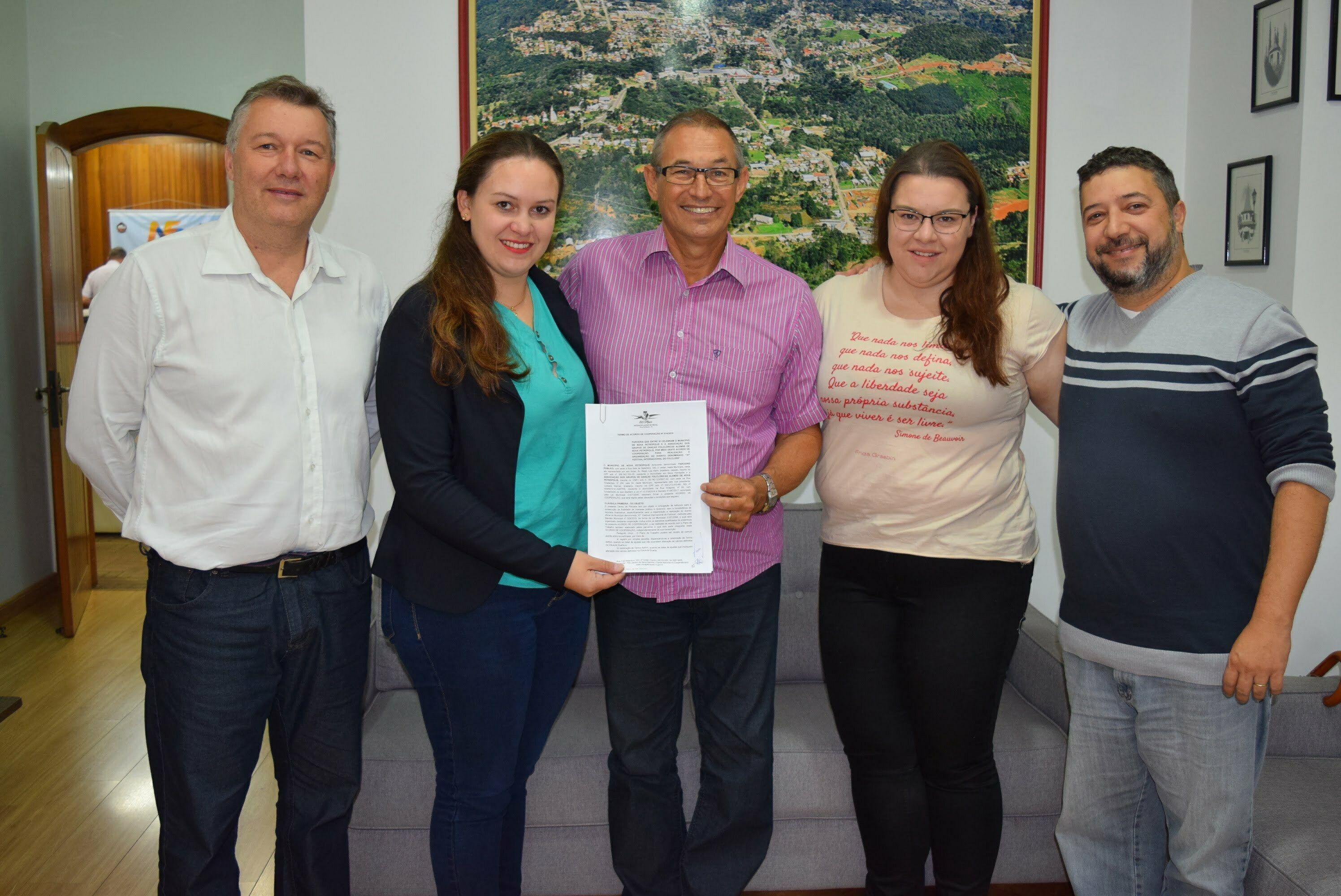 O prefeito de Nova Petrópolis, Regis Luiz Hahn, recebeu a presidente da Associação dos Grupos de Danças Folclóricas Alemãs de Nova Petrópolis (AGDFA-NP), Lediane Werner, no dia 13 de março, para assinatura do Termo de Cooperação nº 014/2019, que prevê a parceria na realização do 47º Festival Internacional de Folclore. O evento ocorre de 19 de julho a 4 de agosto, na Rua Coberta e Praça das Flores.