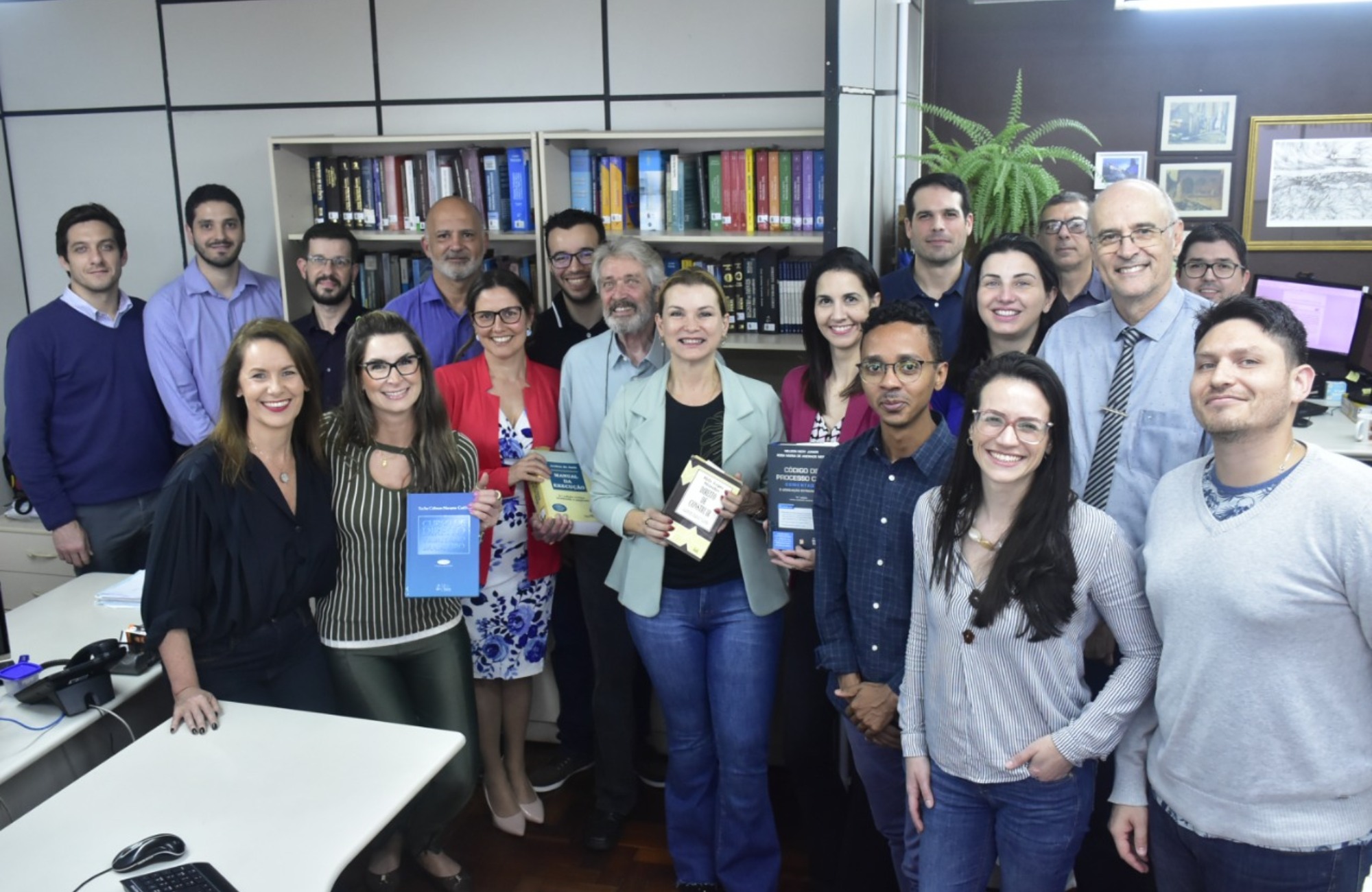 A prefeita Fátima Daudt e a titular da Procuradoria Geral do Município, Fernanda Luft, receberam na tarde desta quinta-feira (18), do advogado Ruy Noronha, a doação de 74 obras de seu acervo pessoal. Os livros agora integram a biblioteca da PGM e envolvem temas como Lei de Licitações, Estatuto das Cidades, improbidade administrativa, tendências do direito público, entre outros. O ato foi registrado em foto junto à estante com parte dos livros e a equipe da PGM.