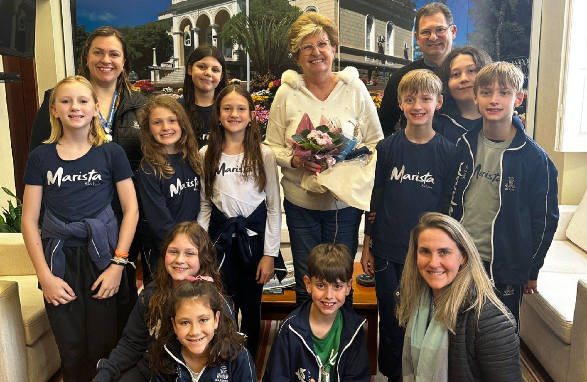 No dia do aniversário de 145 anos do município, a prefeita Helena Hermany recebeu diversas mensagens e visitas especiais em seu Gabinete. Na tarde desta quinta-feira, (28), uma turma de alunos do Colégio Marista São Luís, acompanhada por professores e pelo diretor Ney César Morsch, entregou um mimo para a prefeita. Em nome dos estudantes, a presidente do Grêmio Estudantil Mirim da instituição, Maria Eduarda Fardin, de 10 anos, disse: “É uma pequena lembrança nossa, que a senhora guarde com muito amor e carinho”.