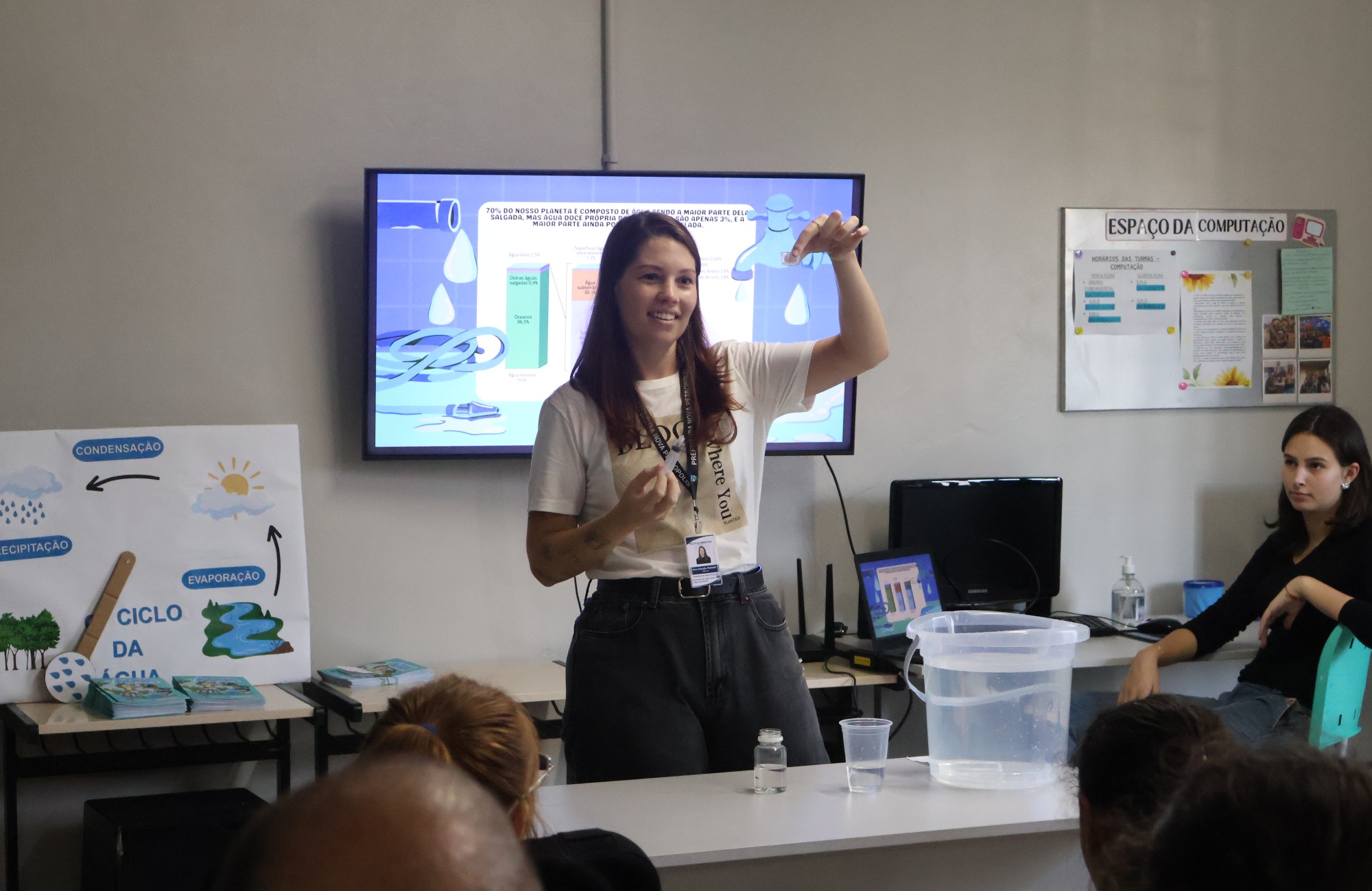 Além das explicações, os estudantes recebem materiais educativos com instruções e atividades sobre o uso consciente da água.