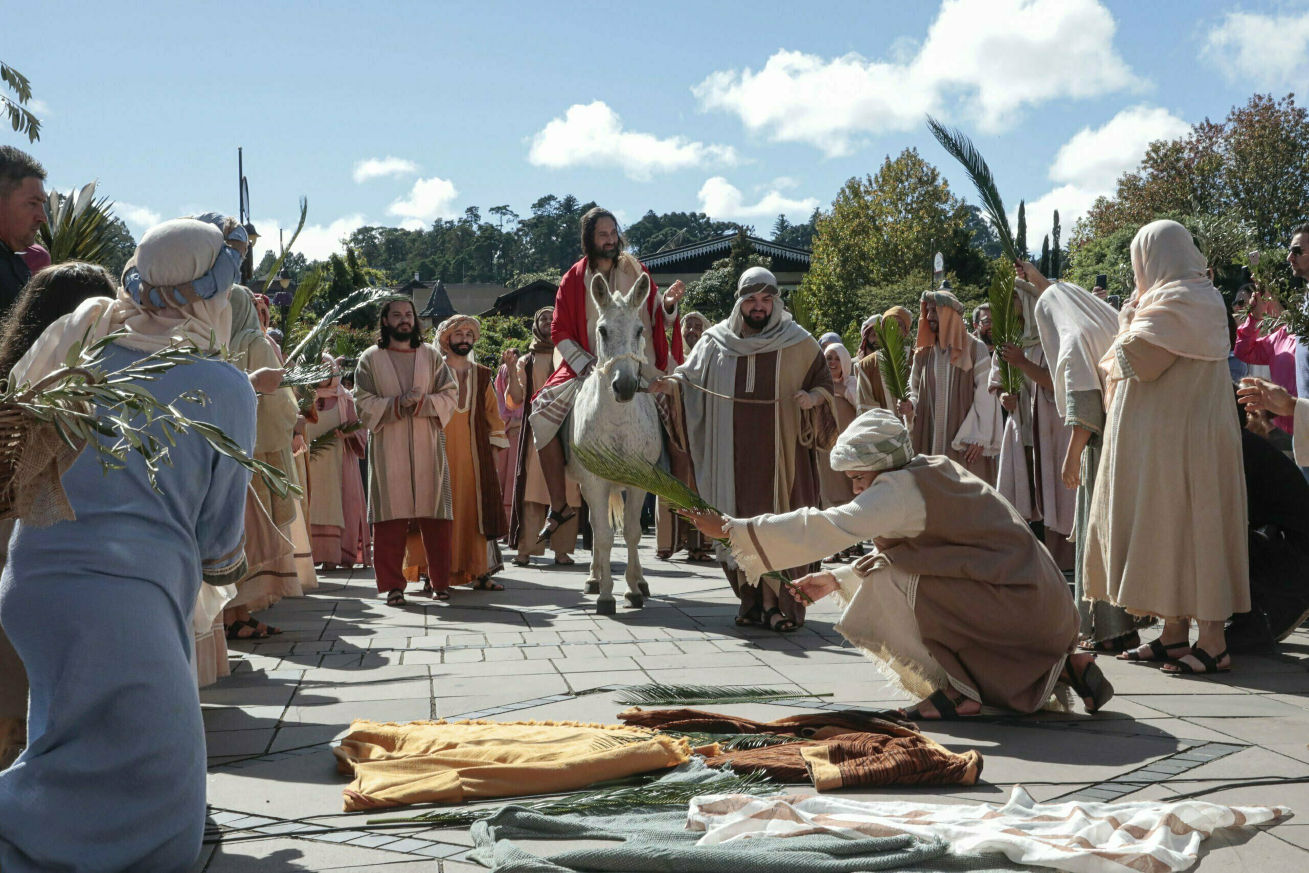 Em tom emocionante, um personagem representando Jesus Cristo fez o percurso montando num jumento e um elenco usou roupas de época para simbolizar a entrada triunfal de Cristo em Jerusalém. Na chegada da procissão, os fiéis que acompanharam o cortejo saudaram o Rei Humilde com ramos de oliveira. “Os ramos são usados para acolher e aclamar Cristo como rei. Porém, o reinado se manifestou na cruz e na ressurreição”, explica o padre Lucas.