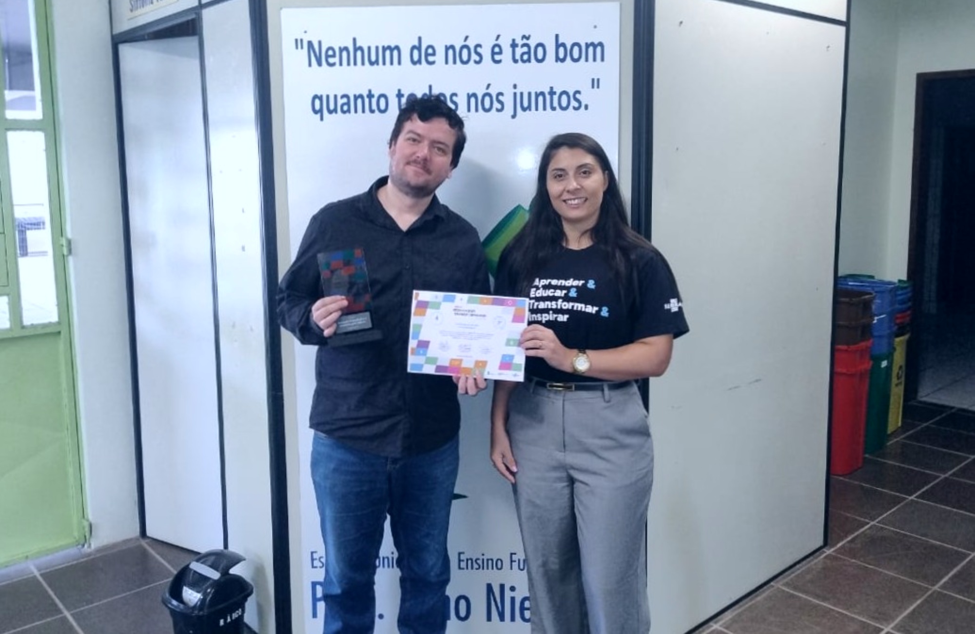 O professor Moisés Bruno de Oliveira, da Escola Municipal de Ensino Fundamental Professor Arno Nienow, de Dois Irmãos, conquistou o terceiro lugar na etapa estadual do Prêmio Educador Transformador, na categoria Inovação Pedagógica e Metodologias Ativas. A premiação foi entregue nesta quarta-feira (22), após o anúncio oficial dos vencedores no dia 16. O reconhecimento foi concedido pelo projeto “Ritmo de Conscientização: Uma Reflexão sobre a Escravidão Contemporânea, o Combate ao Racismo e a Desigualdade Social na Comunidade Escolar”, desenvolvido com estudantes do Ensino Fundamental ao longo de 2025.