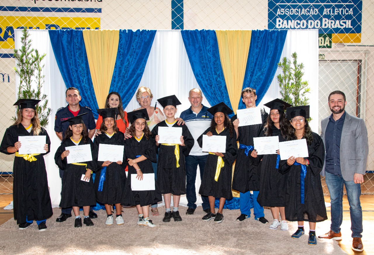 O secretário de educação, Wagner Machado, também se pronunciou. “Parabéns aos pais que incentivam seus filhos em participarem de uma iniciativa tão grandiosa. Saibam que todo este nosso esforço para que este projeto seja cada vez melhor, é para os filhos de vocês, para essas crianças que são o nosso futuro”, salientou. Emocionado com o momento da formatura, o garoto Otávio, de 10 anos, aluno da Escola Dona Leopoldina, de Linha João Alves, levou os pais, Jonas e Fabrine Costa para prestigiar a solenidade. A mãe era só alegria. “É muito bom passar por isso, fico feliz pelo meu filho, porque ele está fazendo uma coisa boa e que faz dele uma pessoa melhor”, afirmou ela. Também prestigiou o evento, representando o 6º Batalhão de Bombeiros Militar, o capitão Thalys Rian Stobbe.