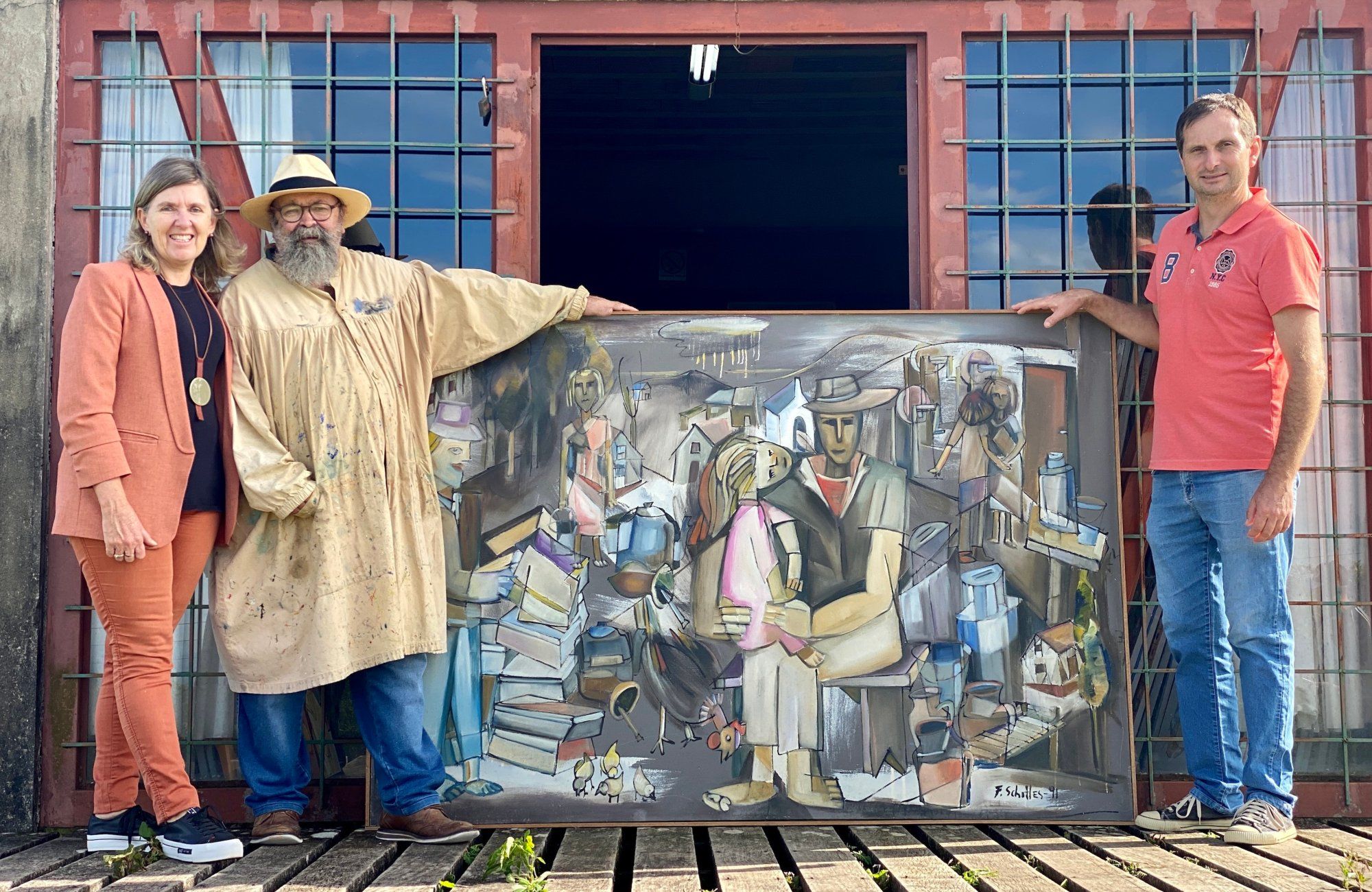 A entrega foi na quarta-feira, dia 8 de março, pelo próprio artista à prefeita Carla Chamorro e ao vice-prefeito Airton Bohn no Atelier Flávio Scholles, na localidade de São José do Herval. Se de um lado do atelier se avista Caxias do Sul e Bento Gonçalves e do outro, se tem Porto Alegre, no coração está um espaço de arte único do artista que traduz a sua aldeia em pinceladas com alma e com uma visão sociológica do mundo.