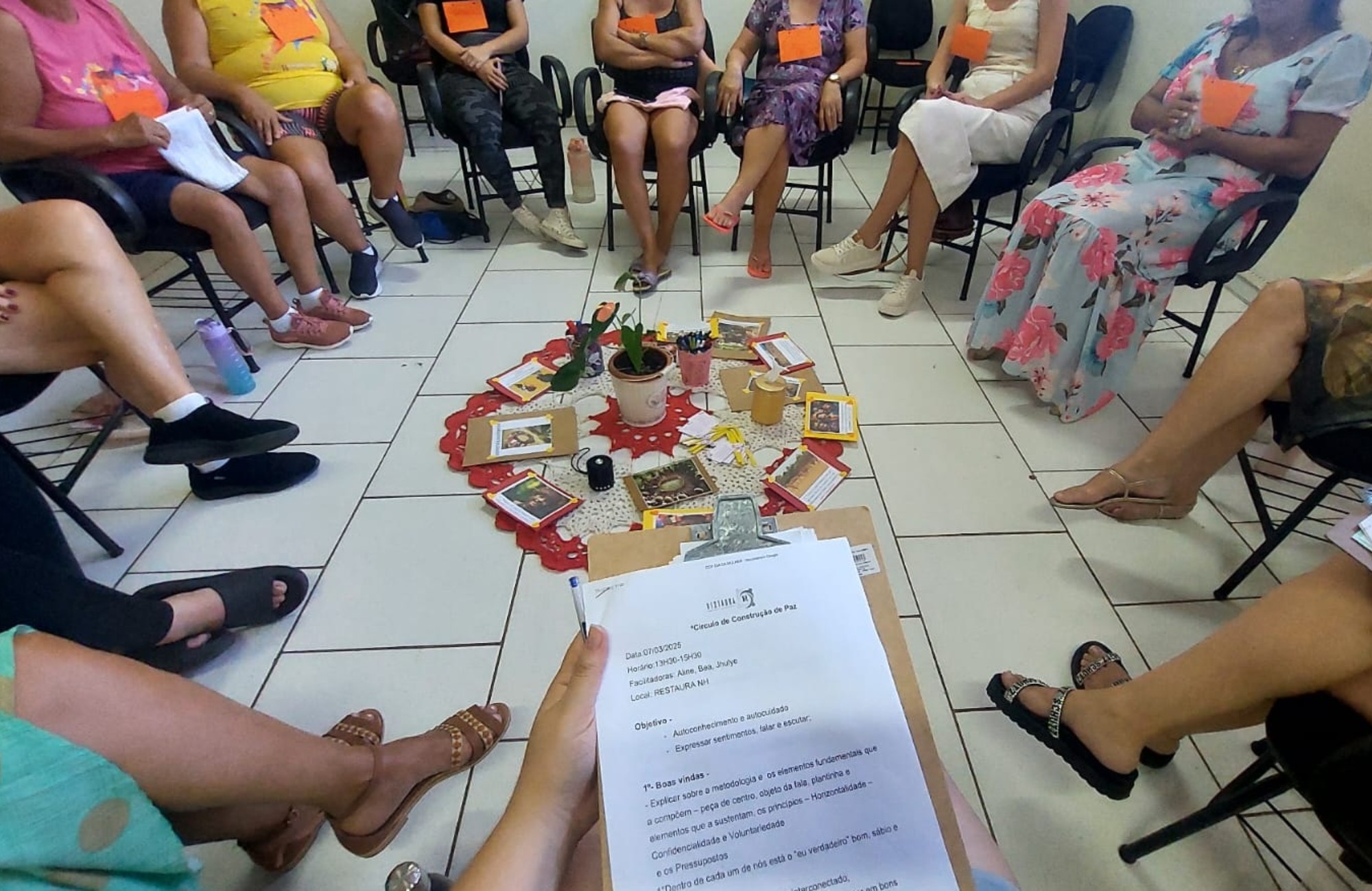 O evento foi mediado por facilitadoras formadas pelo Restaura NH e contou com a presença de servidoras das secretarias municipais de Segurança Pública (SMSP) e de Desenvolvimento Social e Habitação (SMDSH). A presença das profissionais reforçou a importância da rede de apoio e do cuidado coletivo na comunidade.