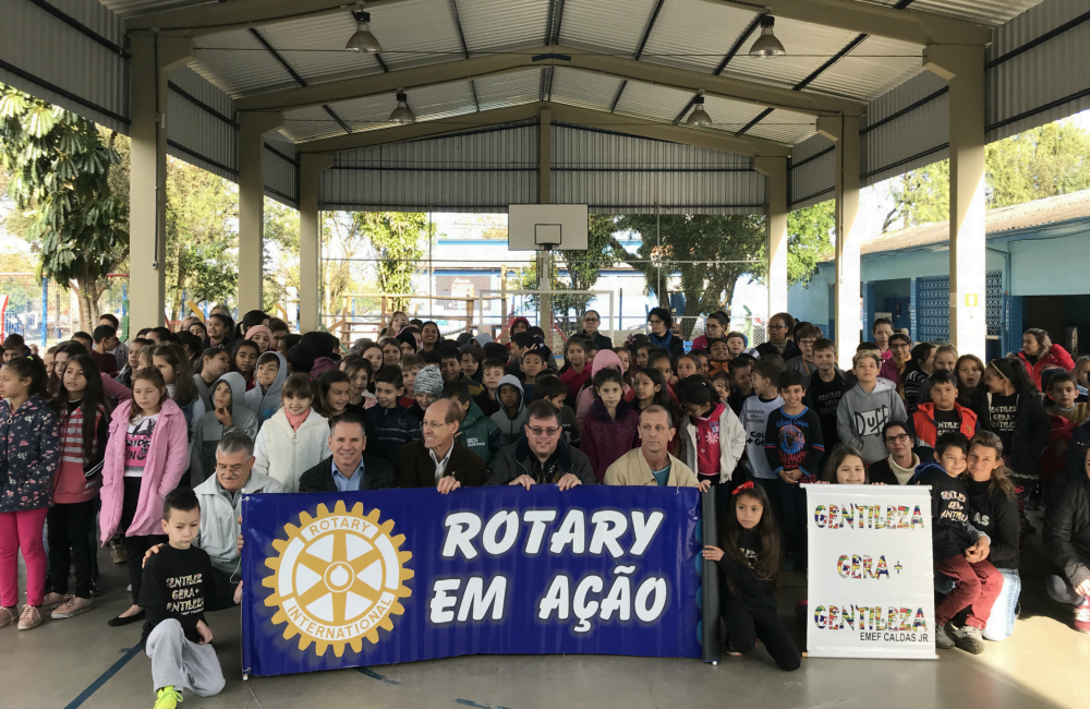 Na manhã desta quarta-feira (26), o Rotary Clube Novo Hamburgo Oeste esteve na Emef Caldas Junior, no bairro Santo Afonso, em Novo Hamburgo, para realizar a entrega das camisetas do projeto “Gentileza gera + gentileza” aos alunos da escola.